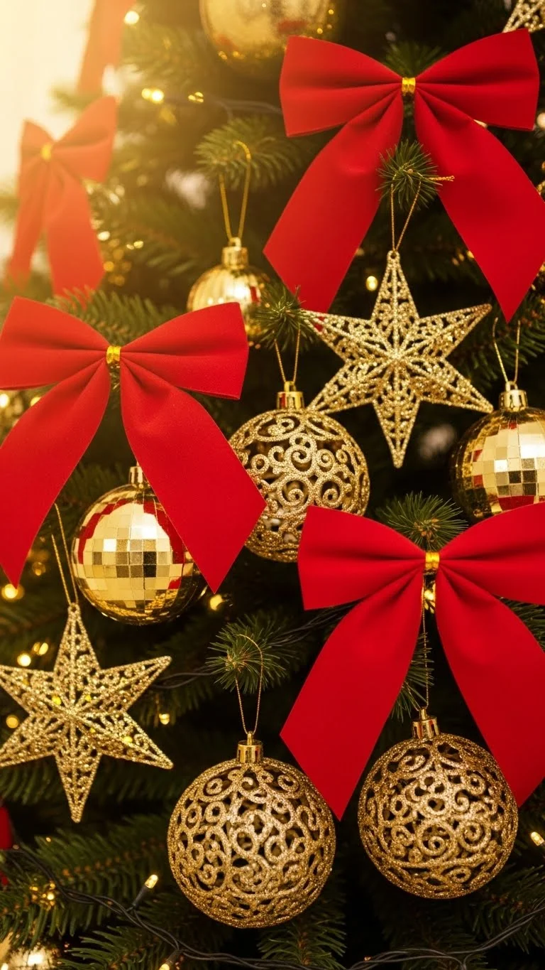 Red velvet ribbon adds warmth to any tree. Wrap long strands around the branches or tie small bows throughout the tree for a soft, classic touch. Mix them with gold ball ornaments to balance color and shine. You don’t need much ribbon—one roll can style an entire tree. If you want a fuller look, add thin gold ribbon as a second layer. Reuse last year’s ornaments and refresh them by attaching small velvet bits with hot glue. This saves money and brings a new texture to your setup. Keep the lower half of the tree heavier with ribbon for a grounded look, and lighten the top for balance. It’s simple, quick, and perfect for small or large trees.