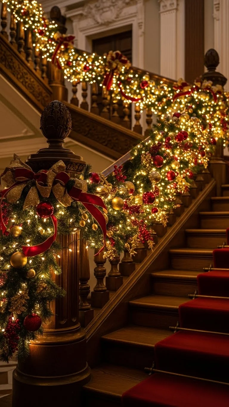 A staircase becomes a centerpiece when you add red and gold garland. Wrap the banister with greenery first. Then add layers of red ribbon, gold beads, and small ornaments. Keep the clusters spaced so the design doesn’t feel heavy. If you’re decorating on a budget, use just ribbon and lights. Use zip ties or twist ties to keep everything secure. Add one large bow at the bottom step to finish the look.