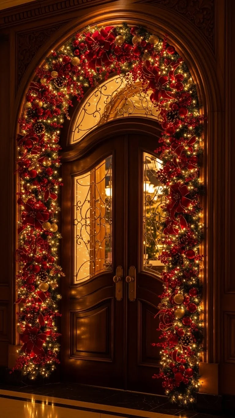 Outlining door frames adds warmth and makes your home feel inviting. Choose a red garland and mix in gold ribbon, small bells, or mini ornaments. Keep the design light so it doesn’t weigh down the frame. Use removable hooks to avoid damage. This idea works for kitchens, hallways, and bedrooms. If your doorway is wide, drape the garland instead of attaching it straight.