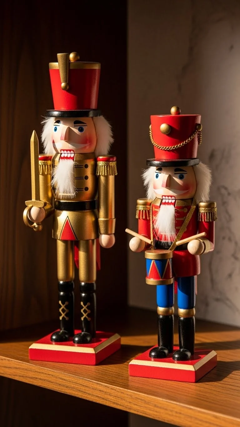 Nutcrackers are timeless décor pieces. Paint them gold and leave small sections red for contrast. You can refresh old nutcrackers you already own or buy inexpensive ones from discount stores. Place them in pairs on mantels, shelves, or entry tables. Add small lights around them if you want a brighter setup. Keep the designs simple so they don’t feel busy.
