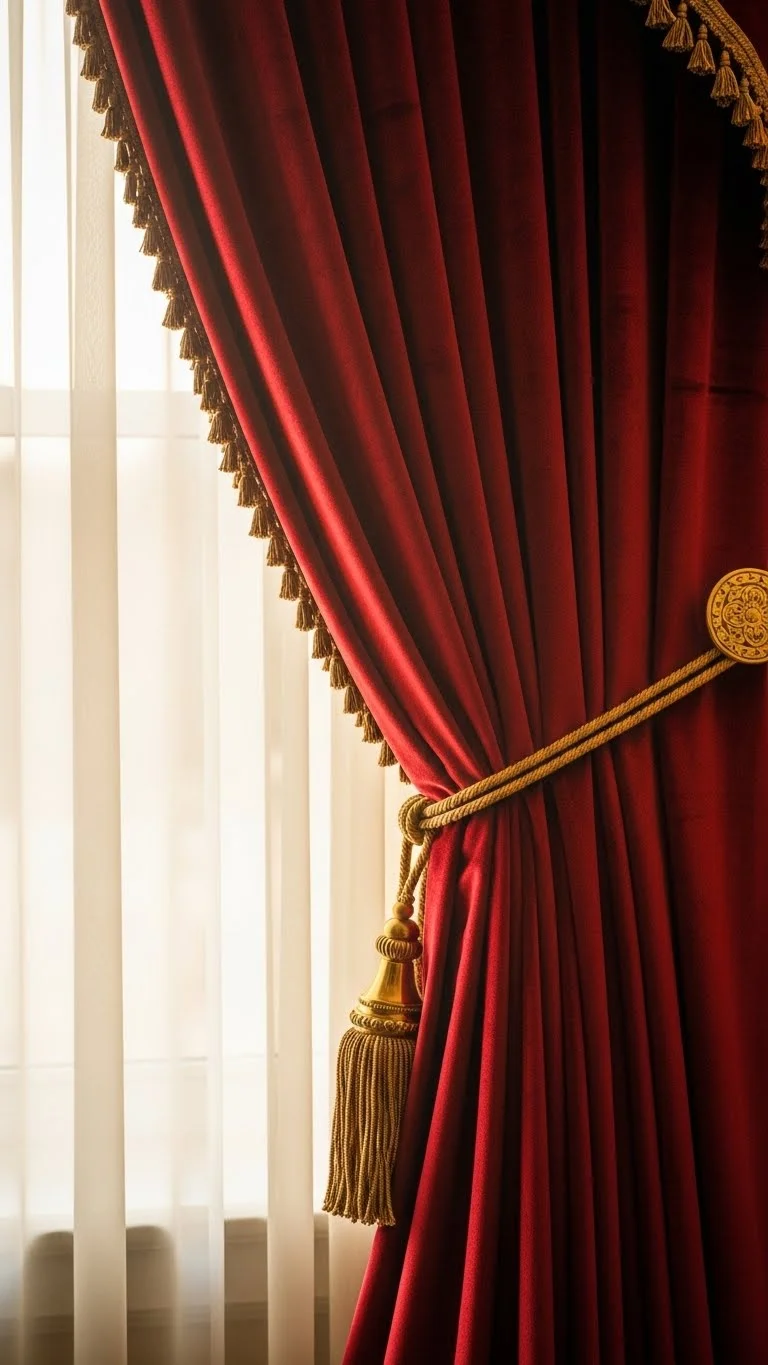 Swapping curtains adds a dramatic touch. Choose deep red panels and pair them with gold tiebacks or tassels. This setup works great in living rooms and dining spaces. If you don’t want to replace the full curtains, use red fabric overlays or runners to create the effect. Keep the tiebacks simple so the colors stay balanced. Add a small wreath above the window for extra charm.