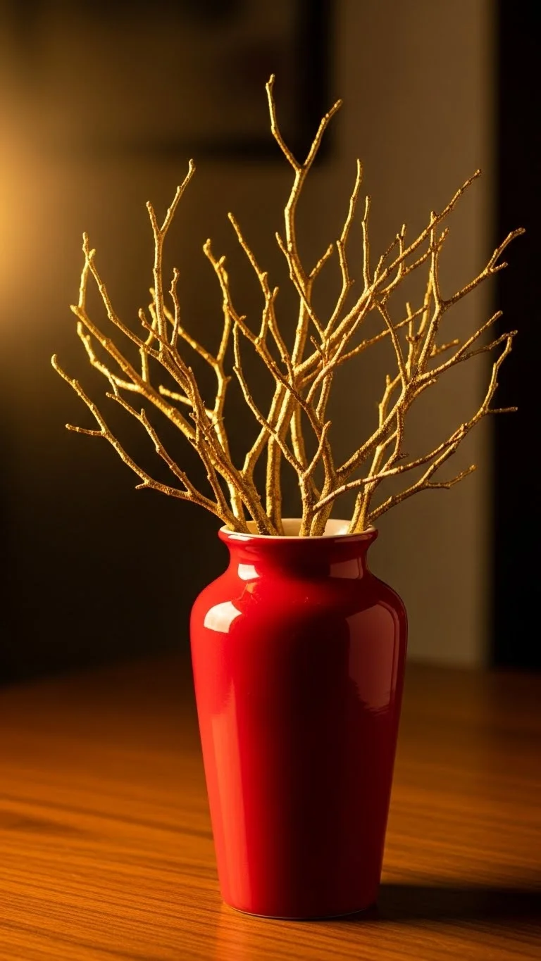 This idea is perfect for minimal décor lovers. Collect branches from outside and spray-paint them gold. Place them in a red vase for a bold contrast. Add small ornaments if you want more texture. This setup works well on console tables, mantels, and kitchen counters. It’s budget-friendly and reusable. If you want height, use taller branches for a dramatic effect.
