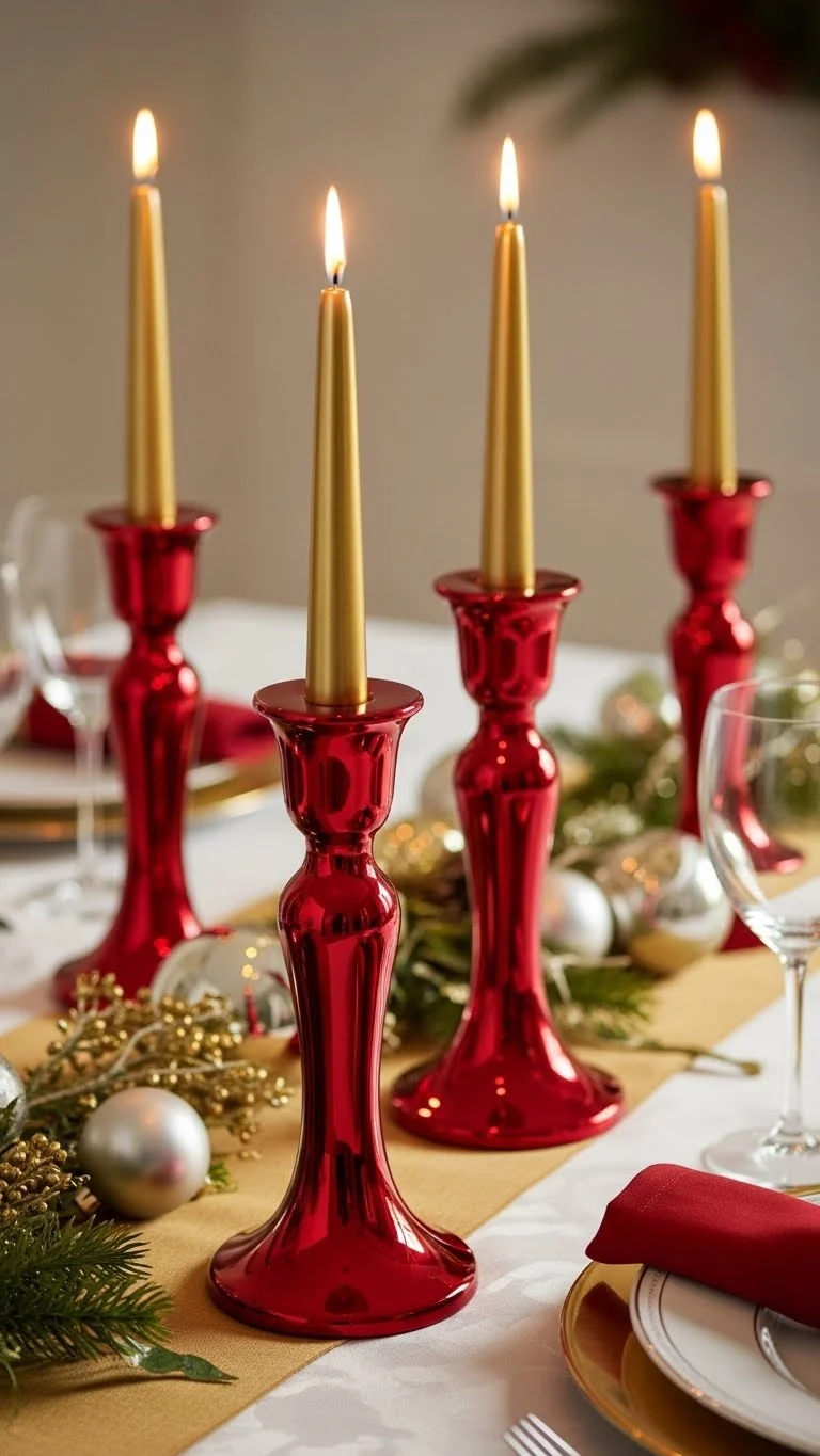 Red candle holders pair beautifully with gold tapers. Place them in groups of two or three along your table or mantel. Add a few pine stems or gold confetti for texture. If you already own plain holders, wrap them with red ribbon to update them. Use battery tapers for a safer option. This setup brings soft lighting and color into any room.
