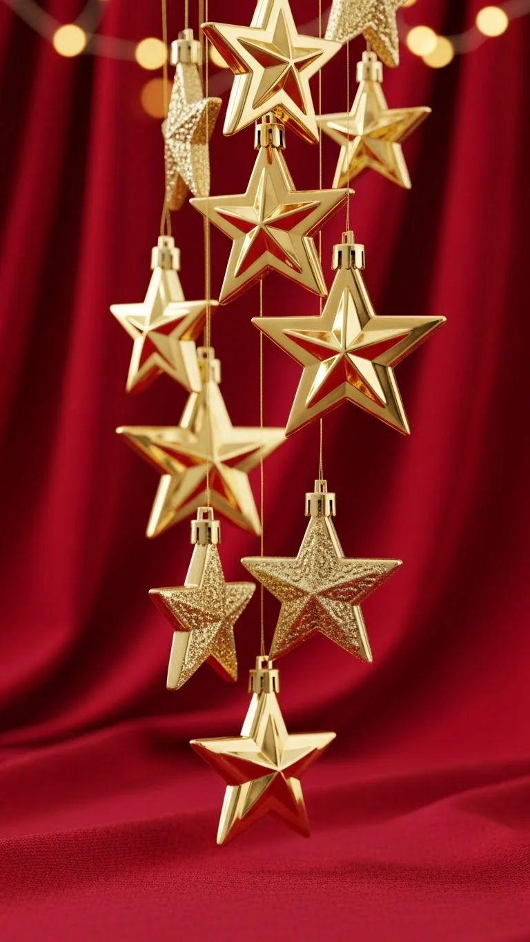 Hang gold stars using clear string against a red backdrop or curtain. This creates a dramatic display behind your tree or dining table. Keep the stars at different heights for movement. Use battery-powered fairy lights to add warmth. This idea works well for photo areas, too.