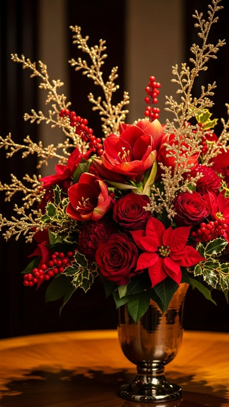 Red florals bring softness to holiday décor. Add gold-stemmed branches or leaves for shine. Use a simple vase to keep the focus on the colors. This arrangement works in any room. If you’re on a budget, mix real greenery with faux florals for a fuller look. Keep the design simple and natural.