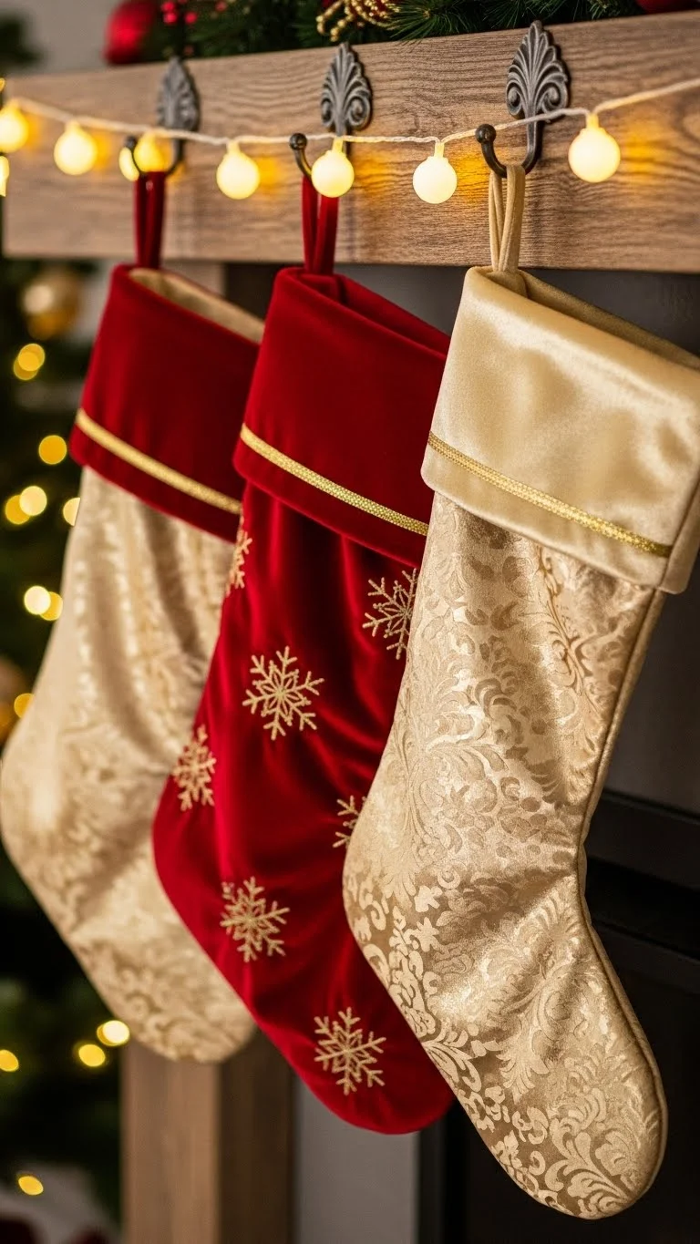 Stockings are an easy place to layer color. Choose simple red stockings and add gold trims or tiny bells to personalize them. Fabric glue works fast if you don’t want to sew. Add one gold letter charm for each family member to keep the look clean. If you already have neutral stockings, attach red velvet strips or gold tassels to update them without buying new ones. Hang them evenly spaced so the colors stand out. If your space is small, hang stockings on a wall ladder or shelf instead of the mantel. This keeps the look organized while adding holiday charm.