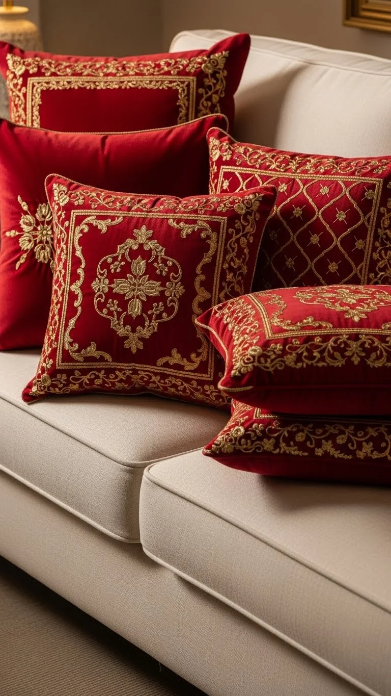 1. Red Throw Pillows with Gold Embroidered Details