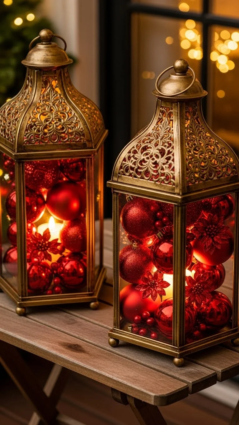 Lanterns make great décor pieces because they’re simple and versatile. Fill them with red ornaments, pine cones, or small gold balls for a charming touch. Add a battery candle inside for warm light. Reuse old lanterns by spray-painting them gold if needed. Place a pair beside your door or fireplace for symmetry. This idea also works for stair landings or under the tree. Stick to one or two ornament colors to keep the look clean.