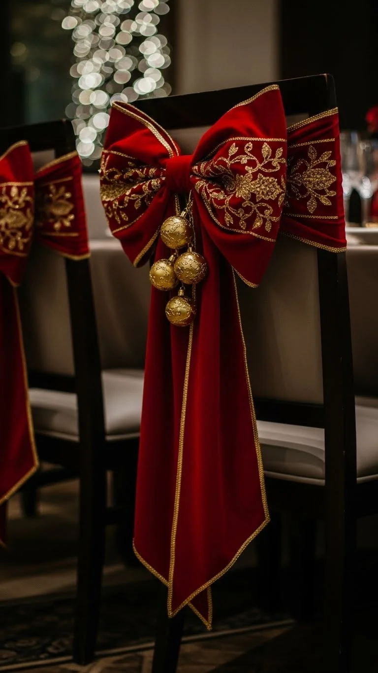 Large bows make your dining space feel festive without much effort. Choose satin or velvet ribbon for a fuller look. Add a small gold ornament hanging from the knot for extra charm. You can reuse the bows every year and adjust the style depending on your table décor. Tie them loosely to avoid bending chair backs. If your chairs don’t allow tying, attach the bows using small adhesive hooks. This simple idea instantly dresses up your dining area.