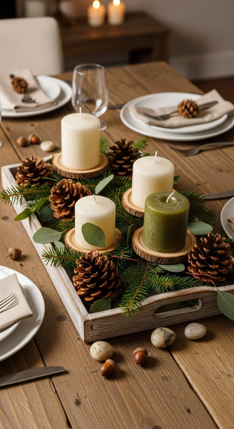 Build a centerpiece using what nature gives you. Arrange pinecones, candles, and fir sprigs on a wooden tray. It feels intentional but effortless. Everything can come from your yard or a short walk outside.