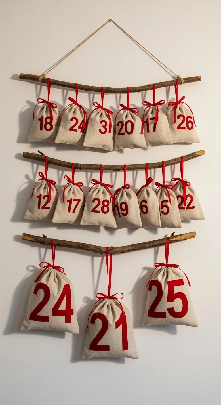 Hang small linen or kraft paper bags from a branch or string line. Label them with numbers and fill them with tiny treats or notes. It’s an elegant, natural take on a traditional Advent calendar.