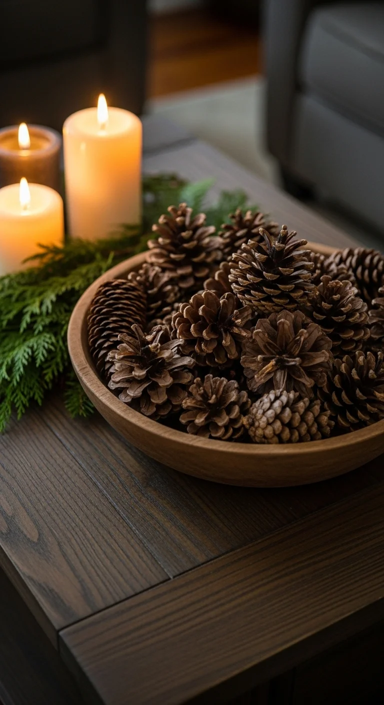 Pinecones are nature’s free decor. Gather them, clean them, and place them in bowls, trays, or jars. You can even dip the tips in white paint or glitter for a light frosted look.