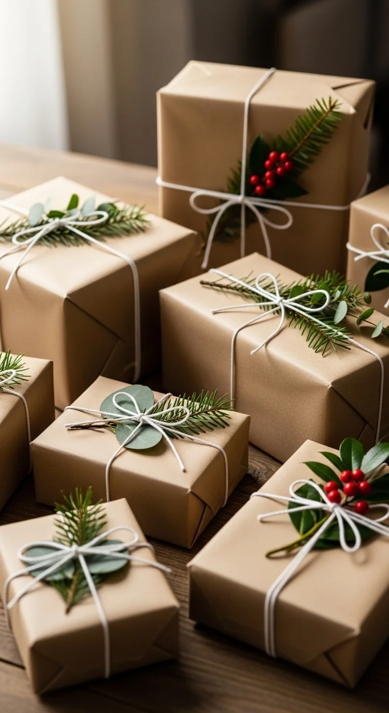 Keep gift wrapping minimal with kraft paper and cotton twine. Add a pine sprig or cinnamon stick instead of plastic ribbons. It looks beautiful under the tree and feels earthy and refined.