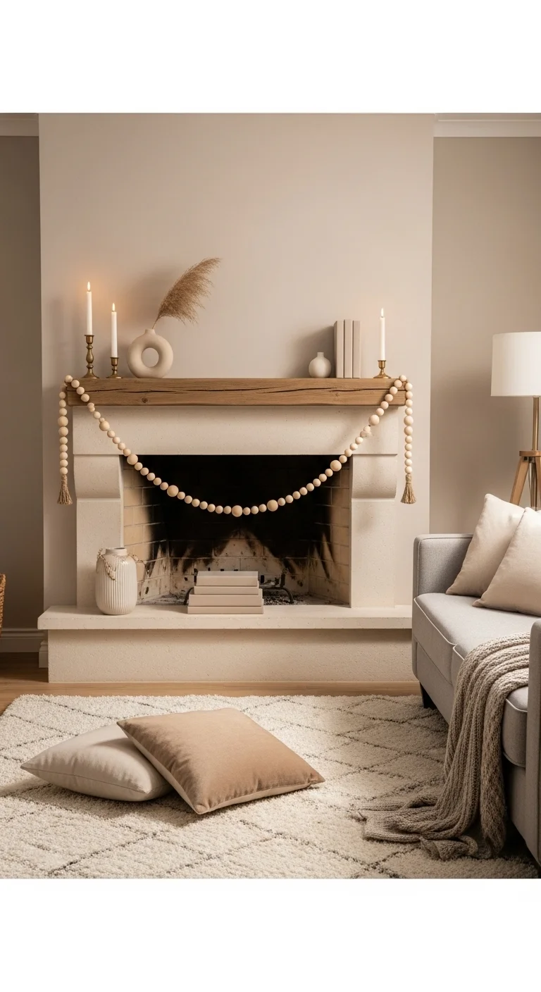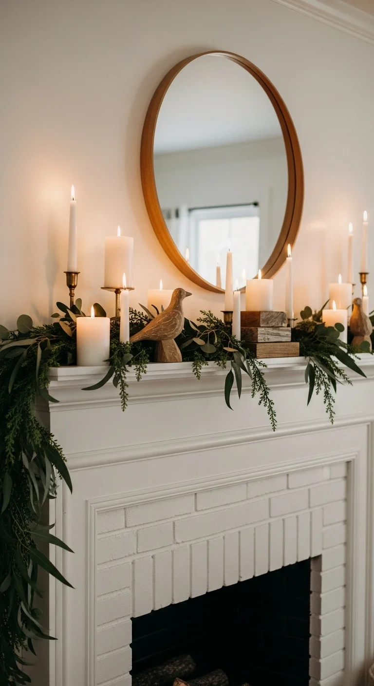 Keep your mantel clean with just greenery, candles, and wooden decor. Less is more here. A few meaningful pieces make the space feel calm and connected to nature.