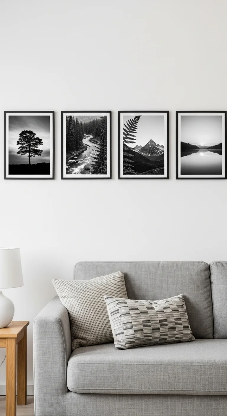 Hang black and white prints or minimal nature sketches. Scandinavian spaces often use art to bring in calmness. Stick with thin black frames or light wood for a cohesive feel.