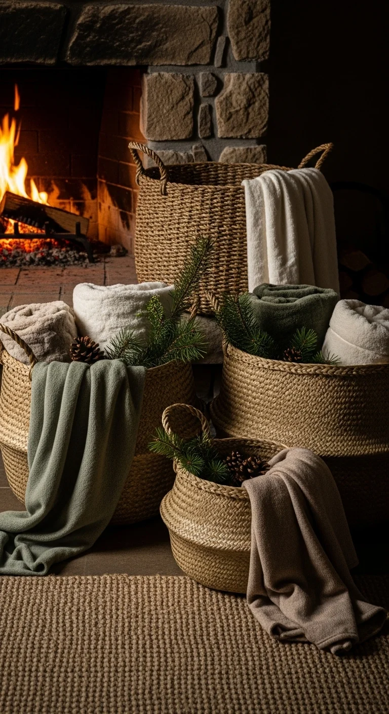 Use woven baskets to hold blankets, logs, or greenery. They add texture without clutter. Choose light wicker or seagrass to maintain that airy Scandinavian look.