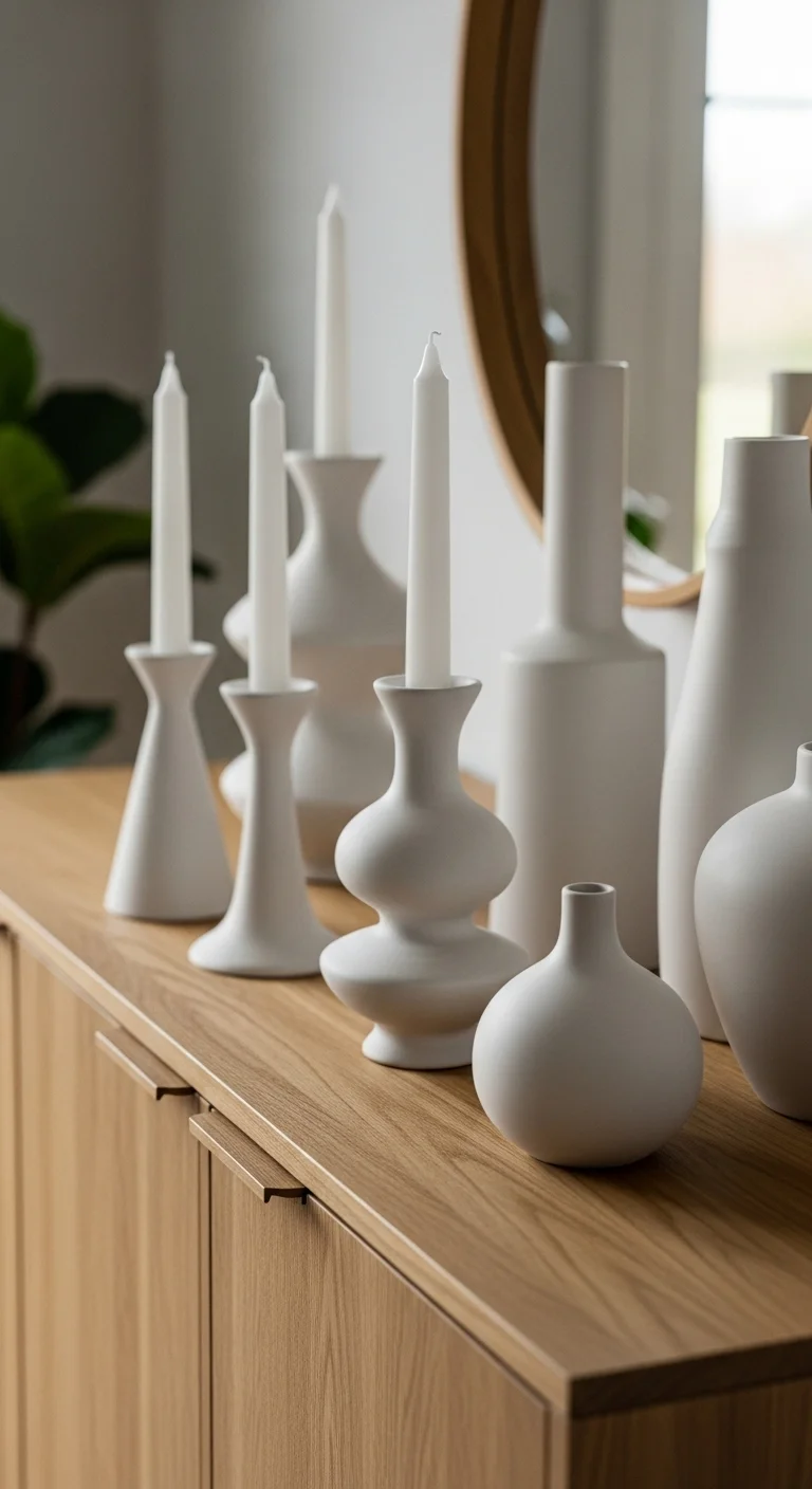 White ceramics — vases, plates, or candle holders — bring soft elegance to your decor. Group a few on a wooden surface for a clean, modern contrast.