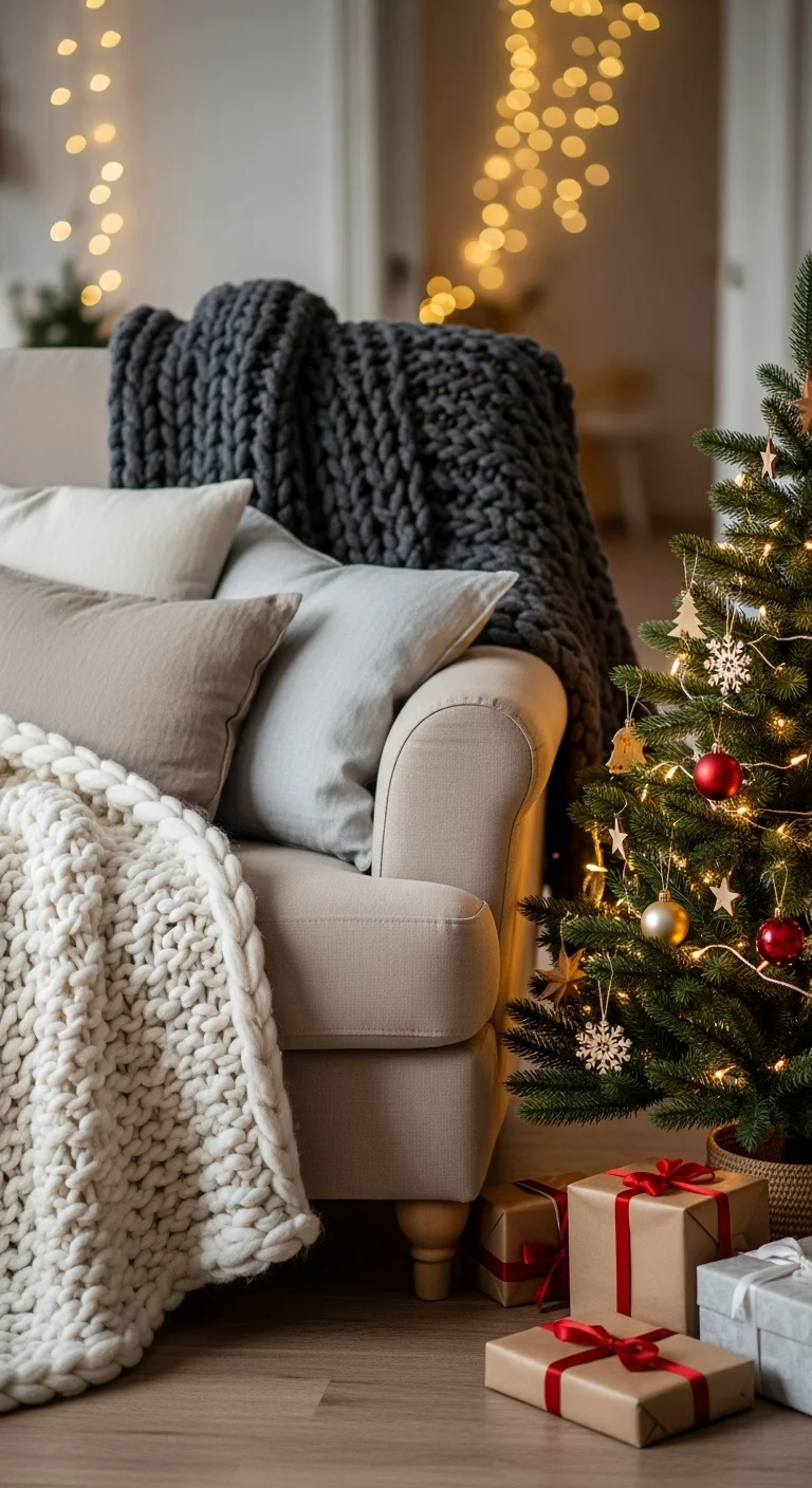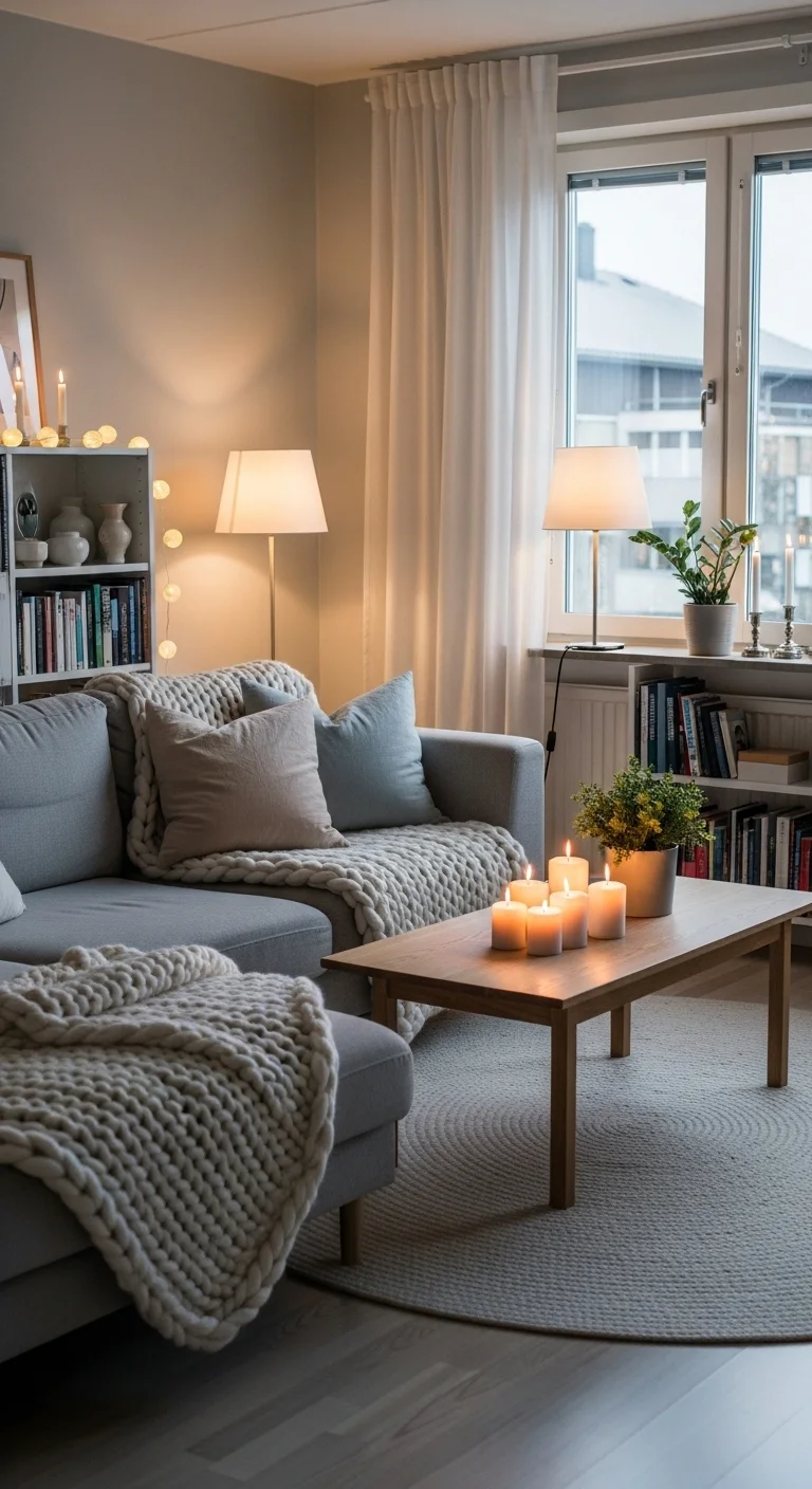 Scandinavian comfort comes from texture, not clutter. Layer your sofa or chairs with chunky knit blankets and soft linen cushions. Stick to neutral colors like cream, taupe, and gray for that soft winter vibe.