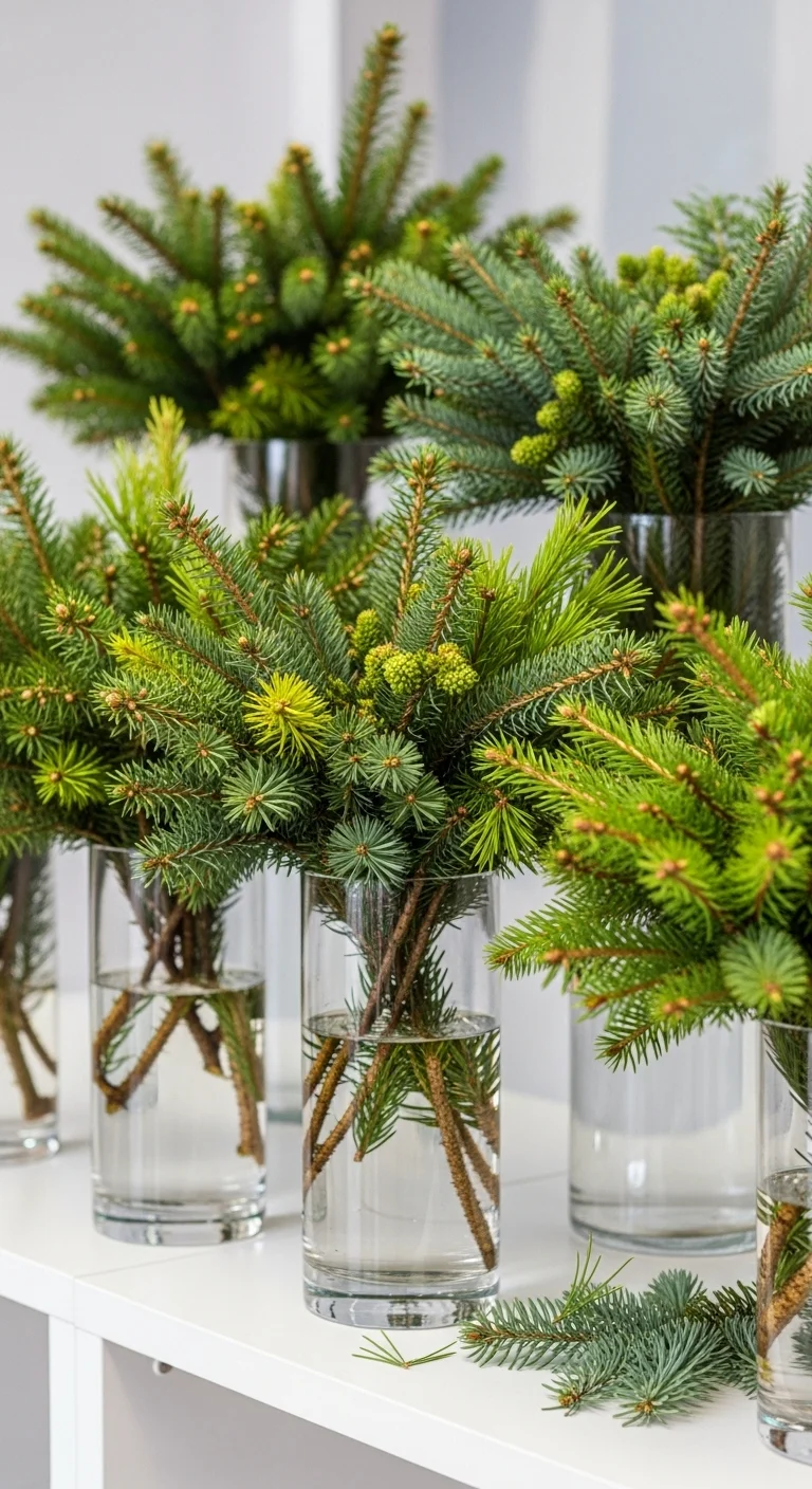 You don’t need a full tree to feel festive. Place cut evergreen branches in clear or ceramic vases. It’s budget-friendly and lasts for weeks. Try mixing pine with eucalyptus for a subtle scent and soft green tones.