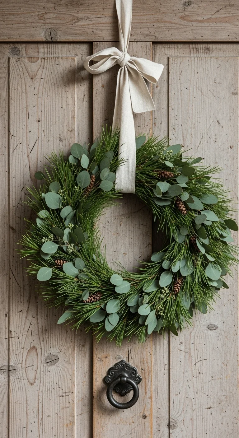 Make a minimal wreath using eucalyptus or pine. Keep it unadorned except for a linen or jute ribbon. Hang it on your front door or above the fireplace for a natural statement piece.