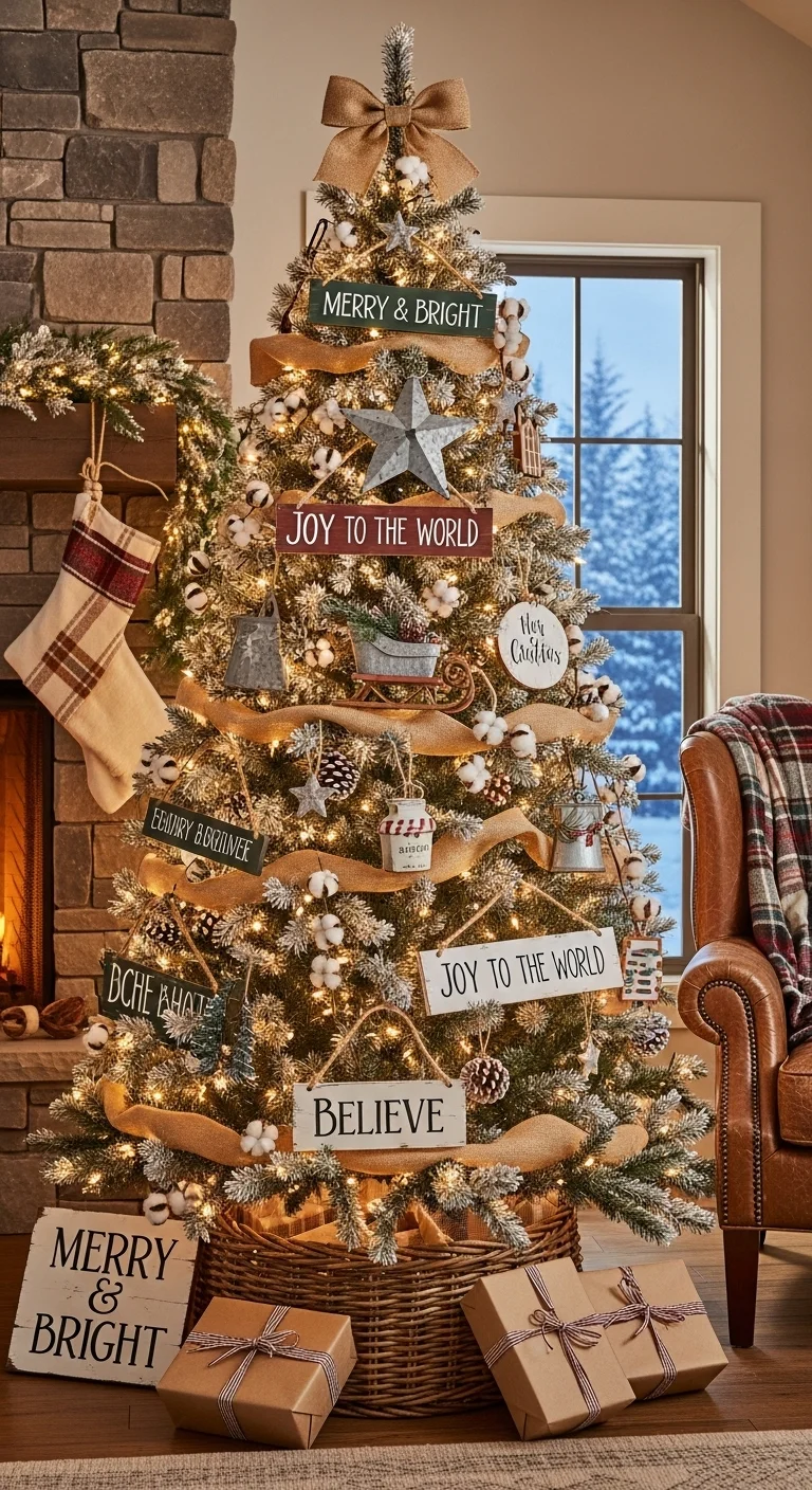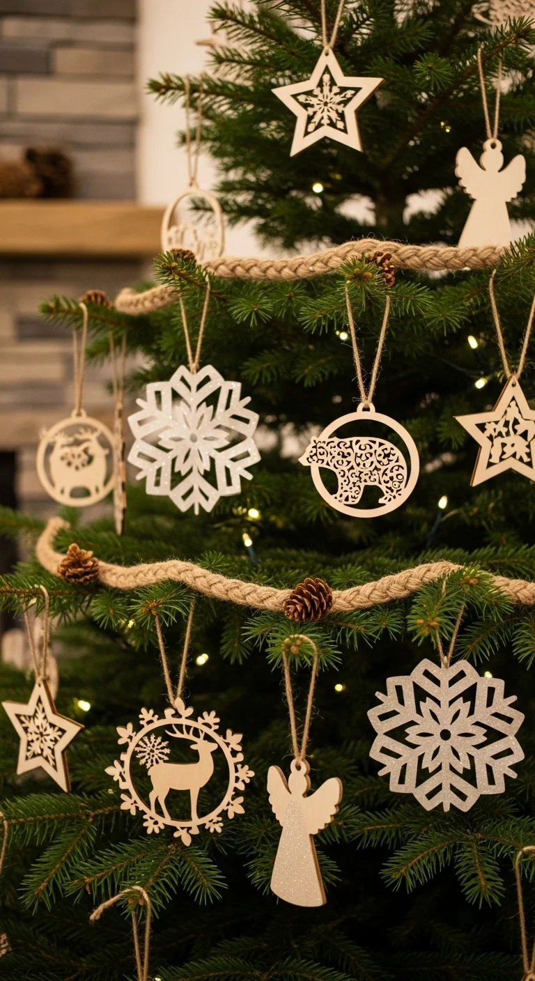 Wood ornaments feel handcrafted and warm. You can make your own with unfinished wood slices and paint pens. Add twine garlands for texture. These simple touches give your tree a cozy handmade charm.