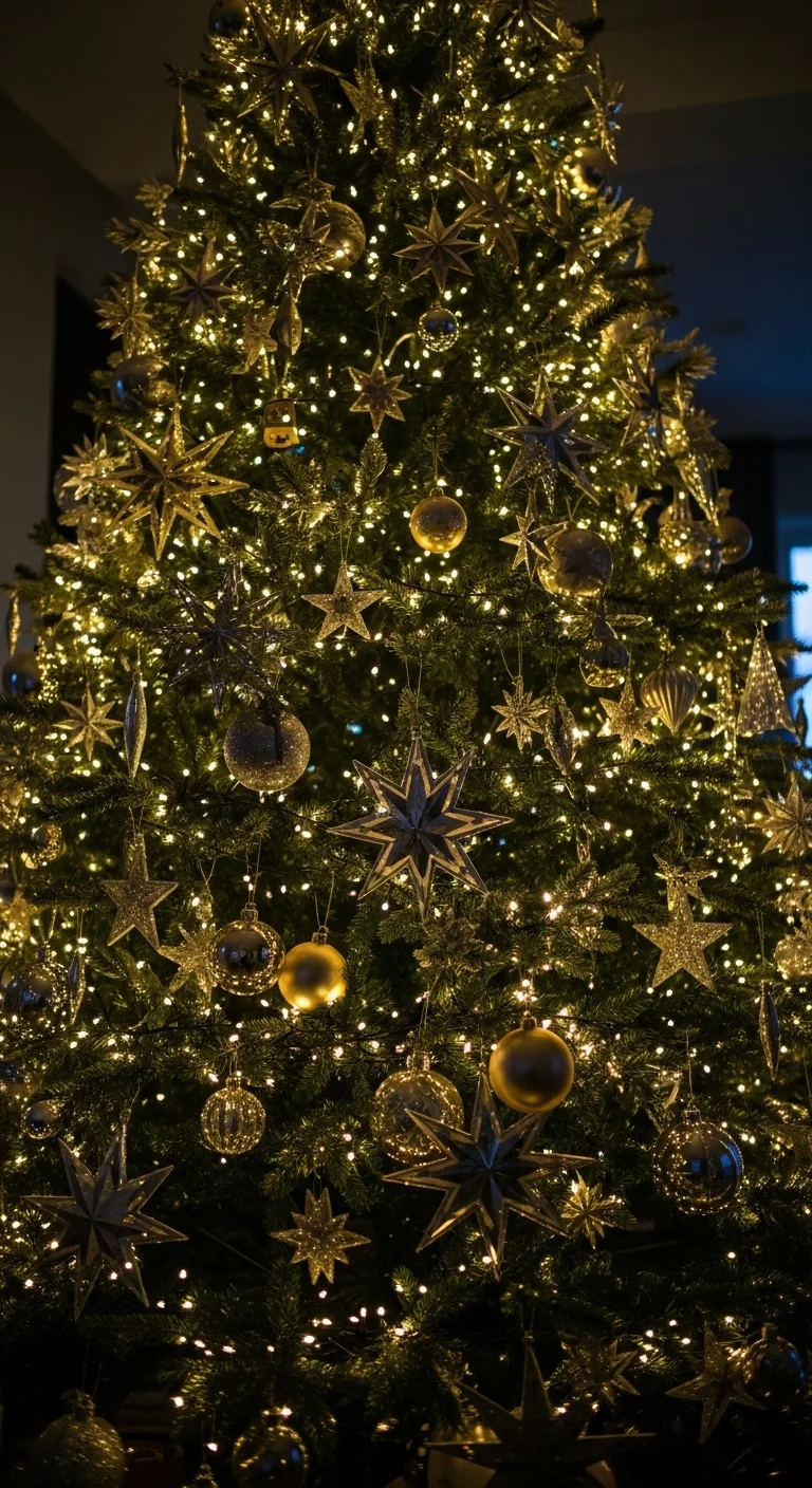 Create a celestial feel with star-shaped ornaments and warm lights. Mix small and large stars across the branches. Use metallic tones to reflect the light and create a dreamy glow.