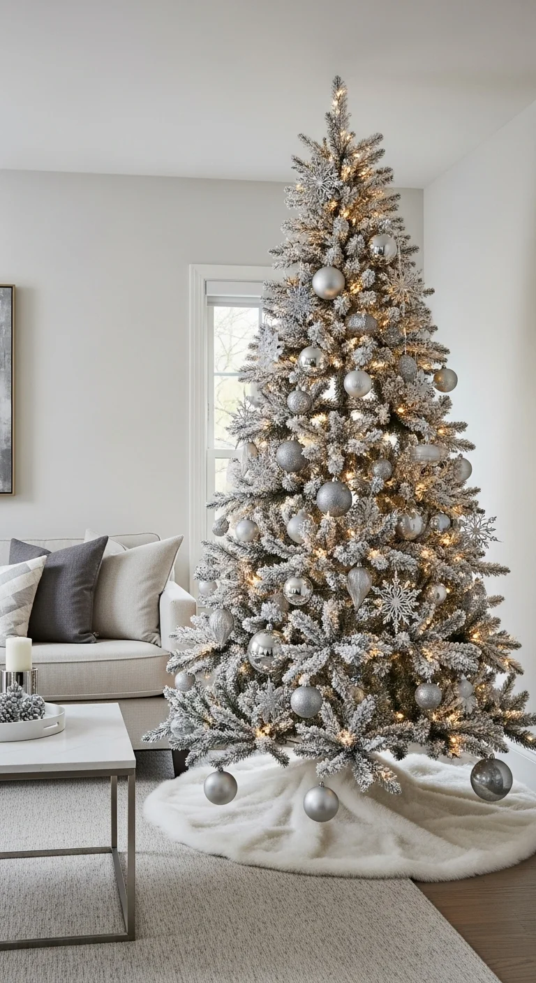 Flocked trees mimic fresh snow. Pair with silver and white ornaments to highlight the icy look. Add subtle glittered details for sparkle. For a DIY approach, use spray snow lightly to get the same effect.