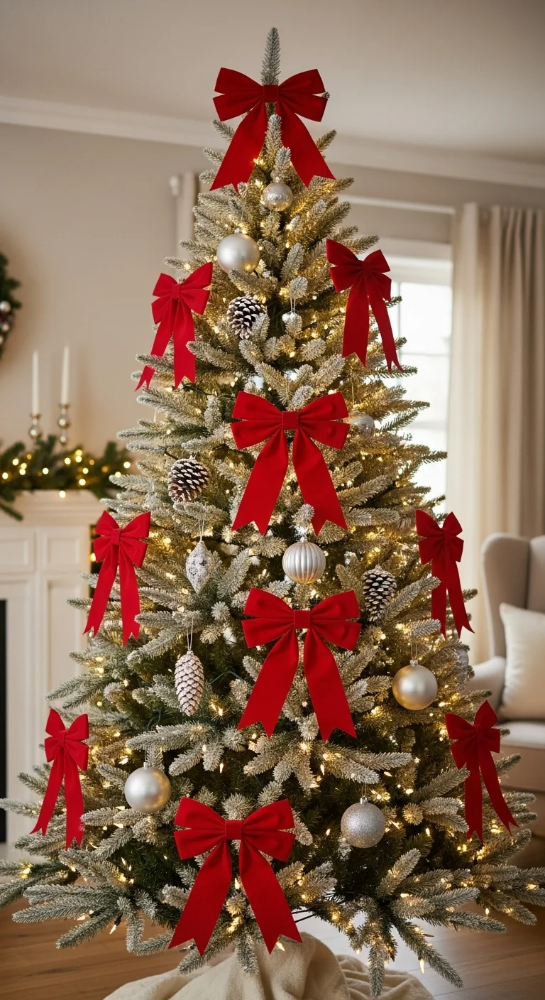 Large red bows make any tree look cheerful and festive. Space them evenly throughout the branches. Use wired ribbon to hold their shape. Combine with white lights and simple ornaments for balance.