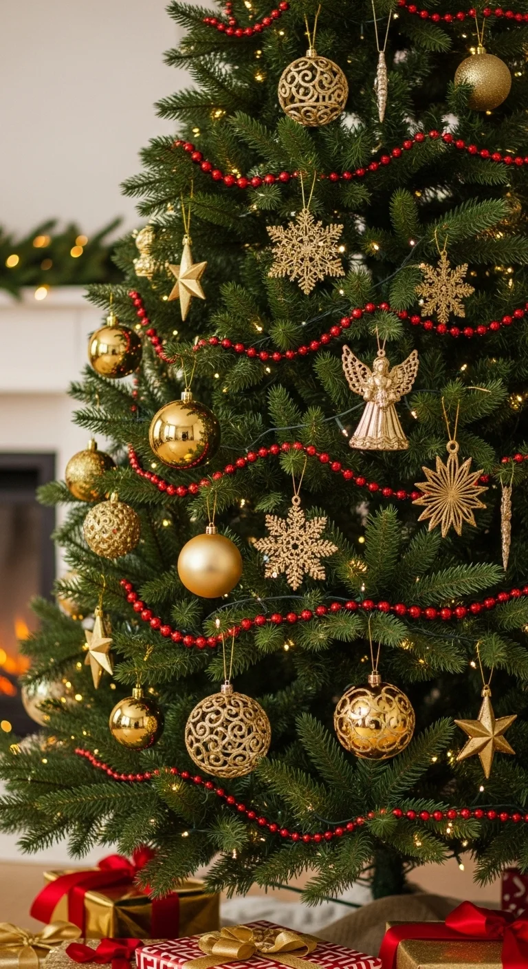 Beaded garlands add old-fashioned charm. Choose red, gold, or silver strands and drape them evenly. Combine with lights and ornaments to create movement and sparkle. They’re reusable and easy to store.