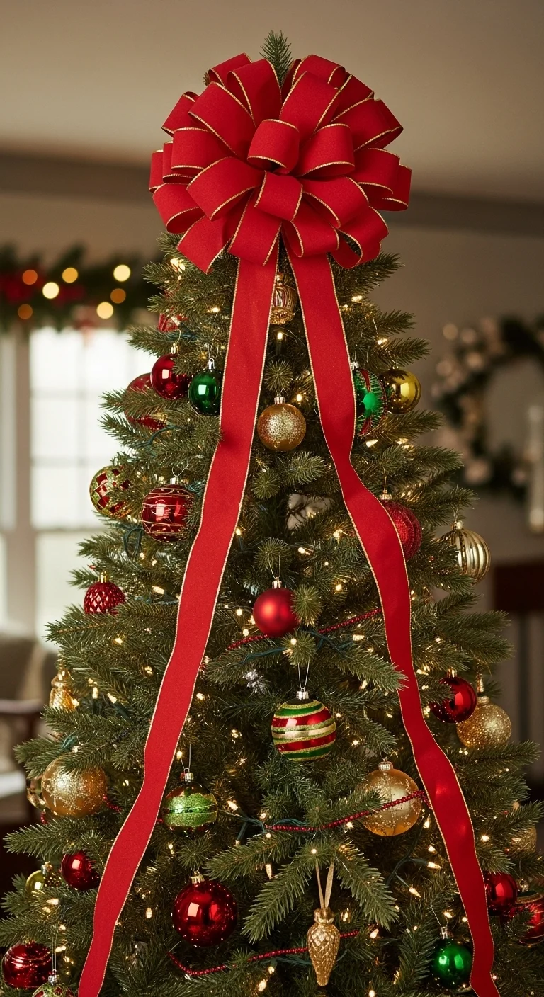 Skip the star and make a big statement with a ribbon topper. Use wide wired ribbon and create a full bow with long cascading tails. It feels festive and elegant, especially on tall trees.