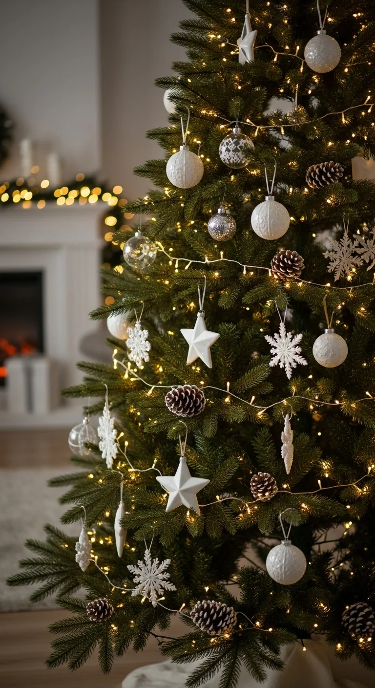 Stick with green and white for a clean, traditional style. Use white bulbs, silver stars, and a hint of snow-dusted greenery. Pinecones and white berries add rustic charm. It’s simple, cozy, and easy to update year after year.