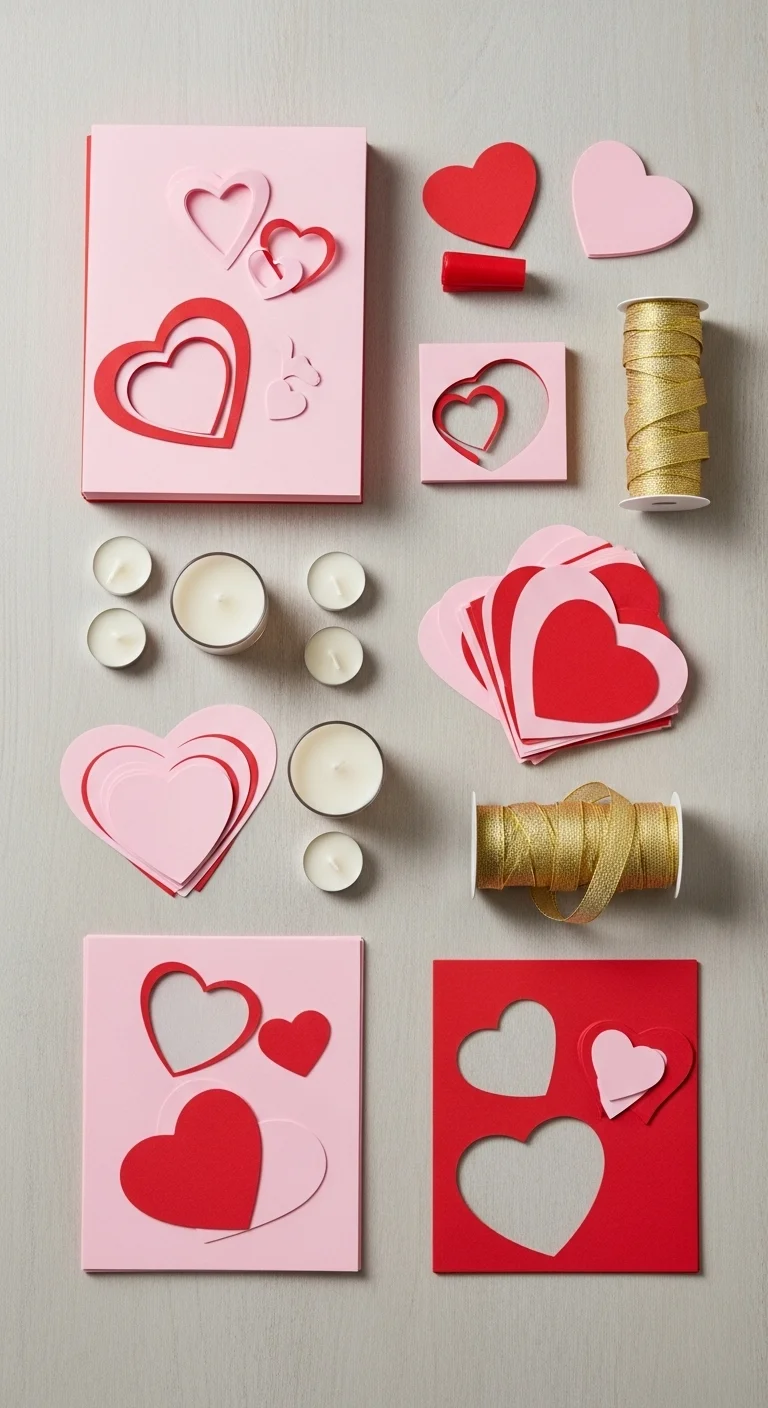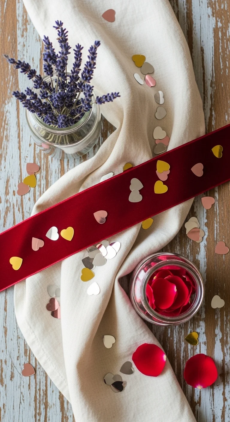 • Metallic accents: gold ribbon, foil hearts, or brass trays