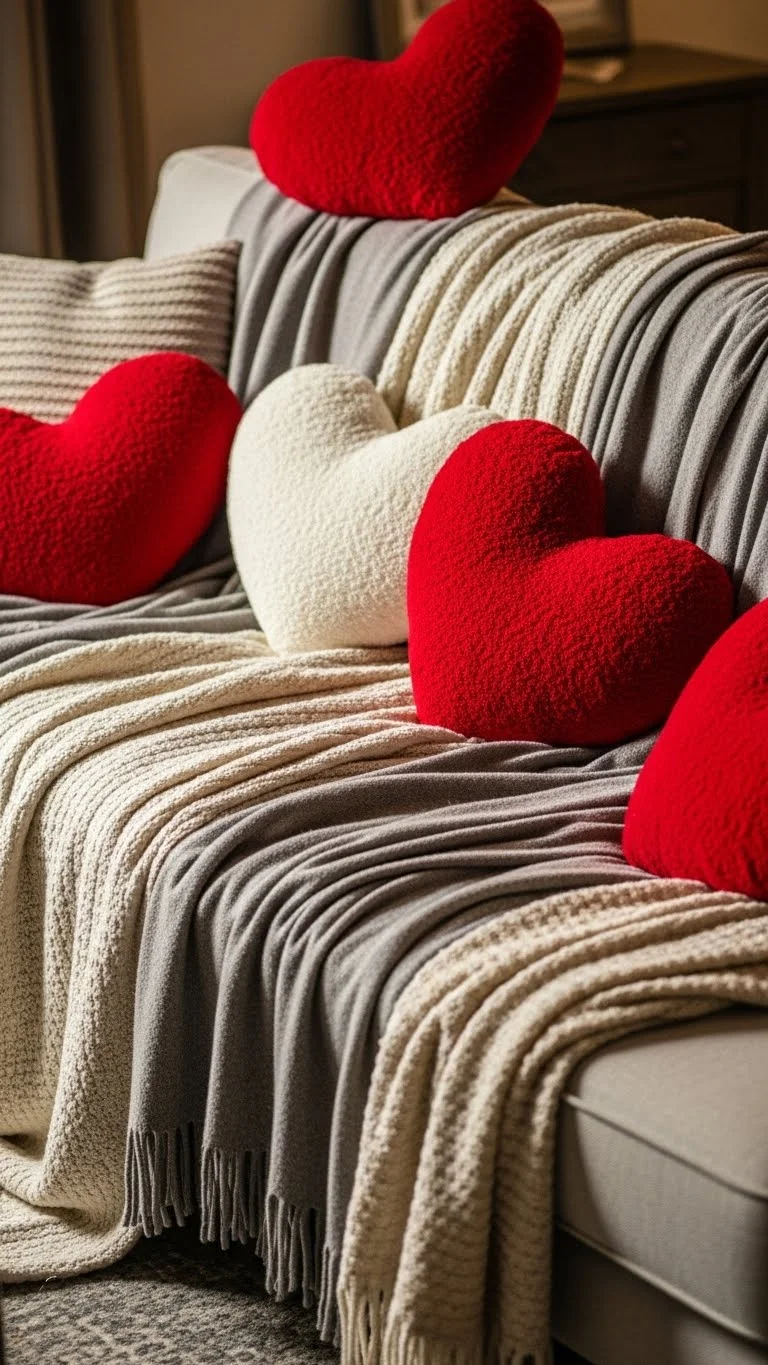 Add heart-shaped red pillows to sofas or beds for a bold yet cozy statement. Pair with neutral throws or blankets to prevent the red from feeling too overpowering. You can DIY pillows with felt or cotton for a personal touch. Heart pillows instantly add romance and focus to your room with minimal effort.