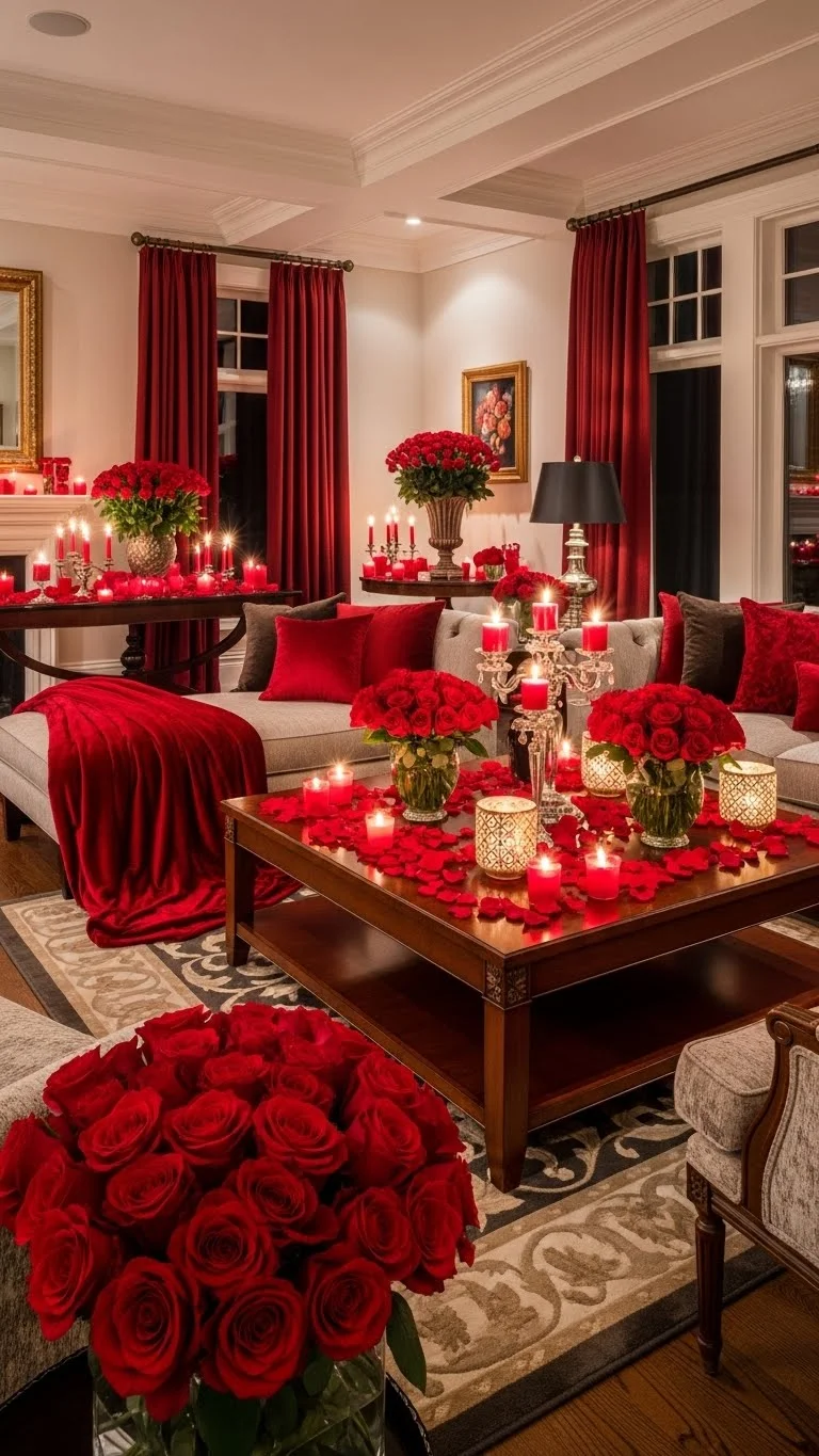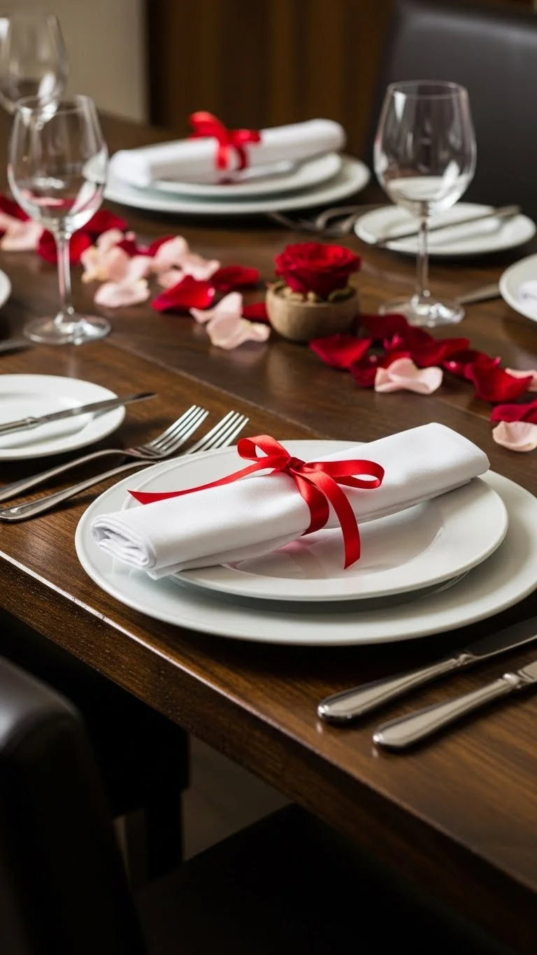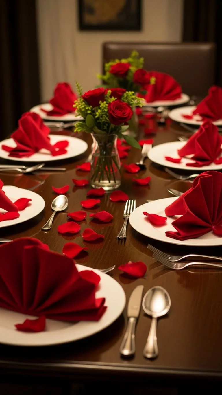 Use red napkins, plates, or glassware to make dining tables pop. Sprinkle rose petals or add small candles for added drama. Coordinated red accents make the table feel styled and bold while remaining inviting.