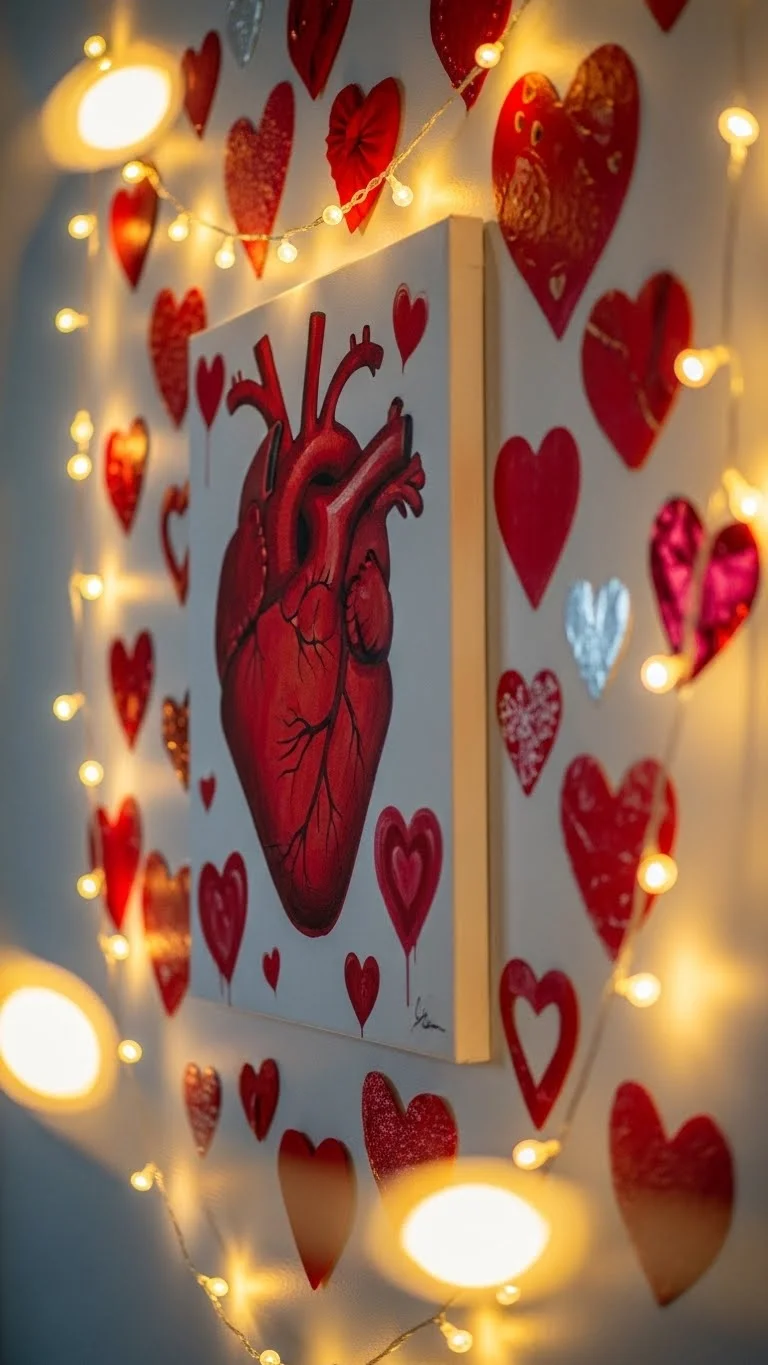 Hang small red prints or heart art on walls. Pair with string lights for warmth. This adds color and personality without cluttering the space.