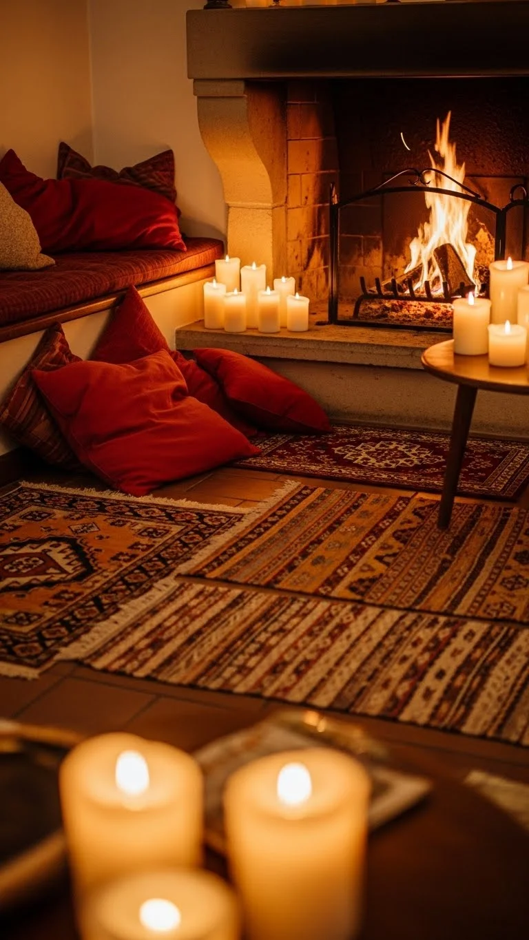 Add red cushions, a small rug, and candle accents near the fireplace. This creates a welcoming, intimate space perfect for Valentine evenings.