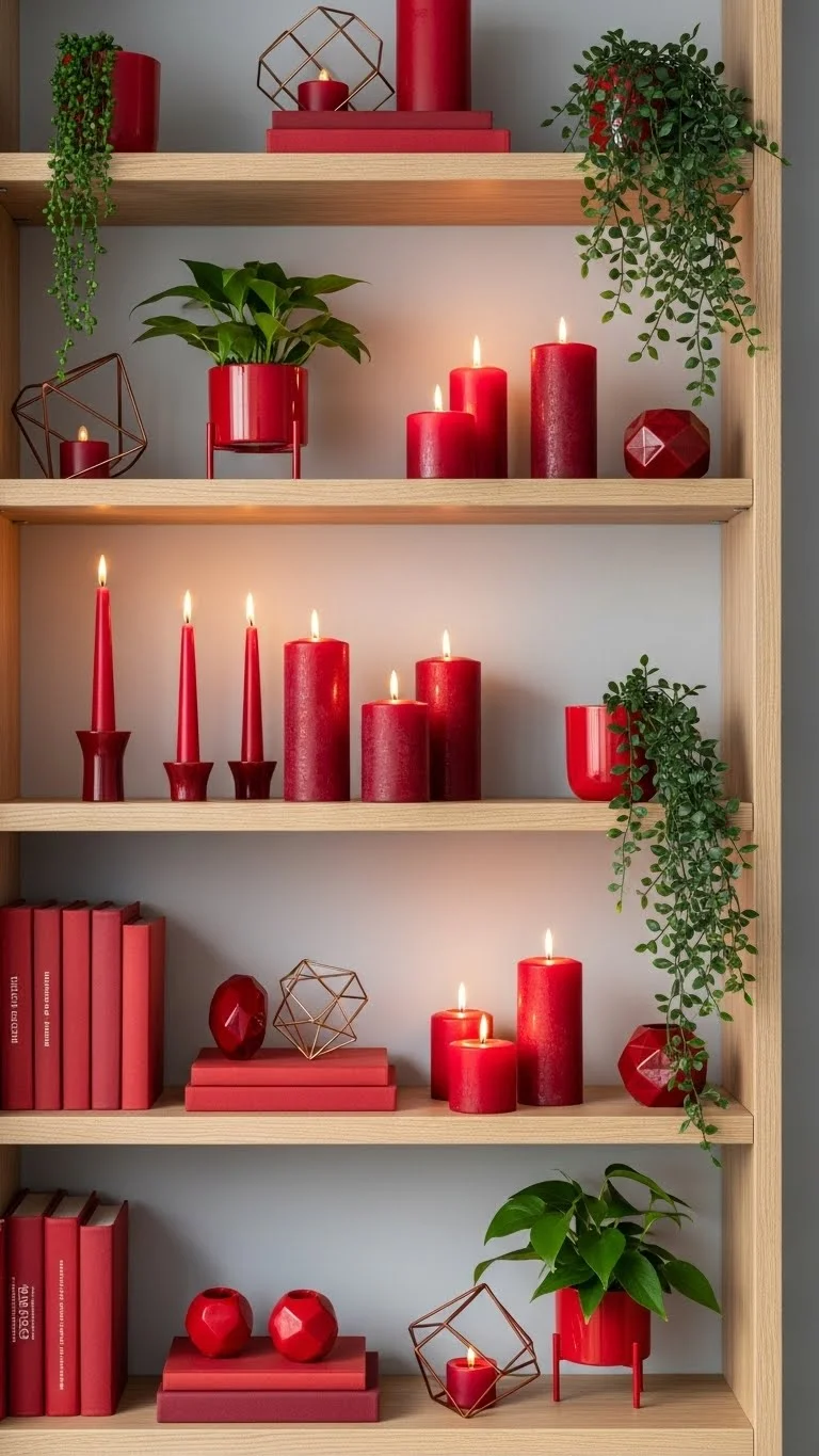 Decorate shelves with red accents, candles, and small greenery. Keep items minimal for balance. The bold color pops while the layered textures maintain interest.