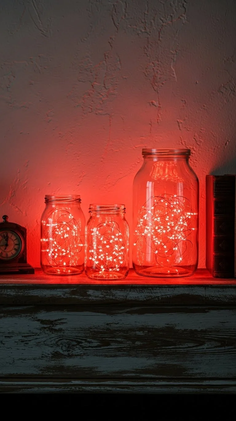 Fill glass jars with red fairy lights for a bold glow. Place them on mantels or side tables. The red illumination adds drama and warmth to any space.