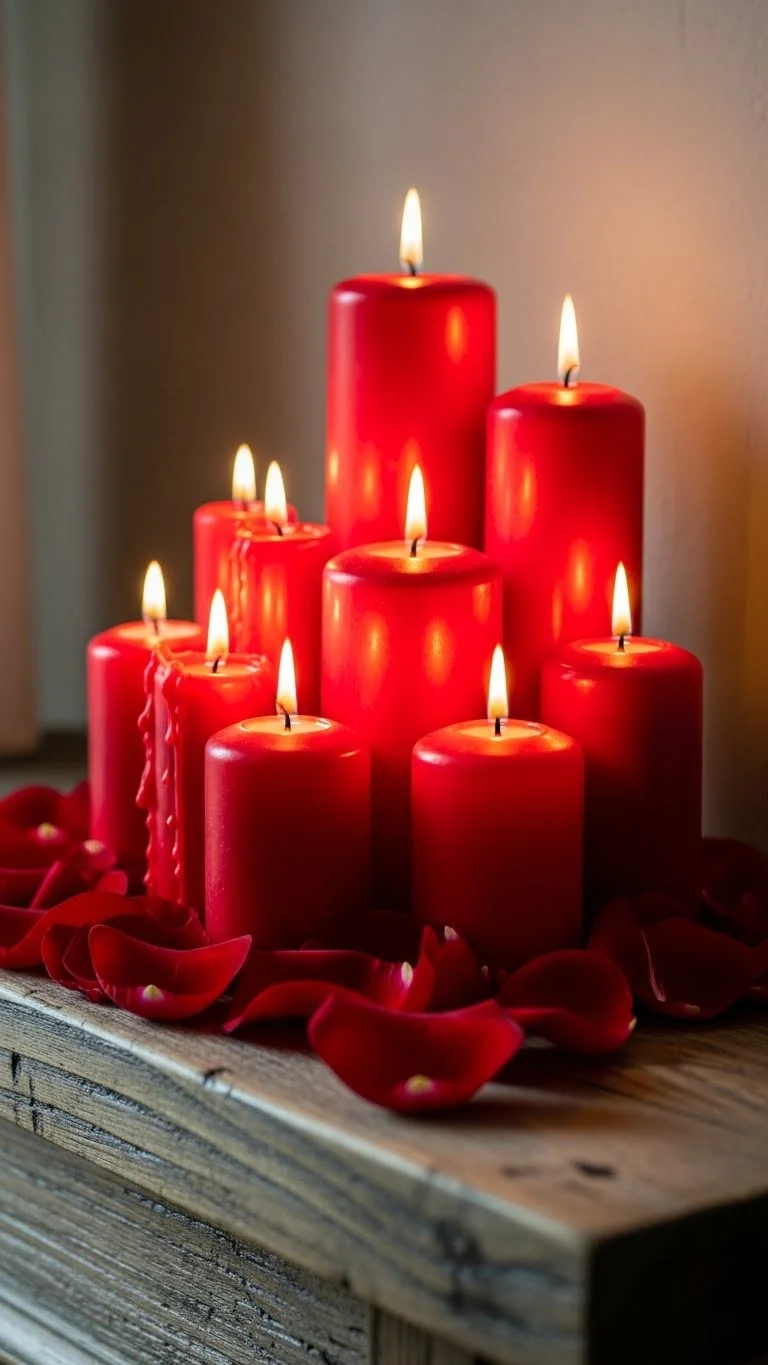 Arrange red candles in clusters of varying heights across your mantel or tables. Mix in glass holders or metallic accents for contrast. Battery-operated candles are safe and budget-friendly. This setup creates a warm, romantic glow while making red the centerpiece of your decor.