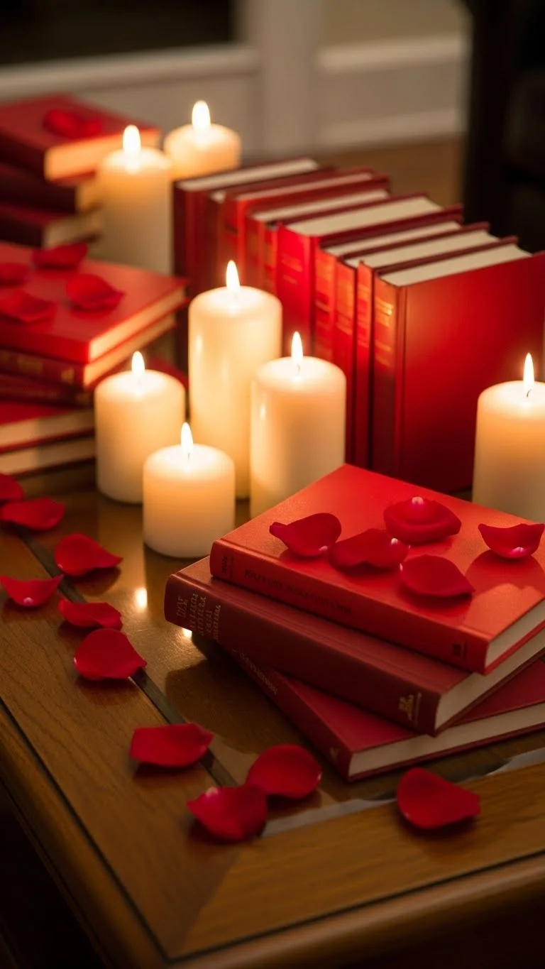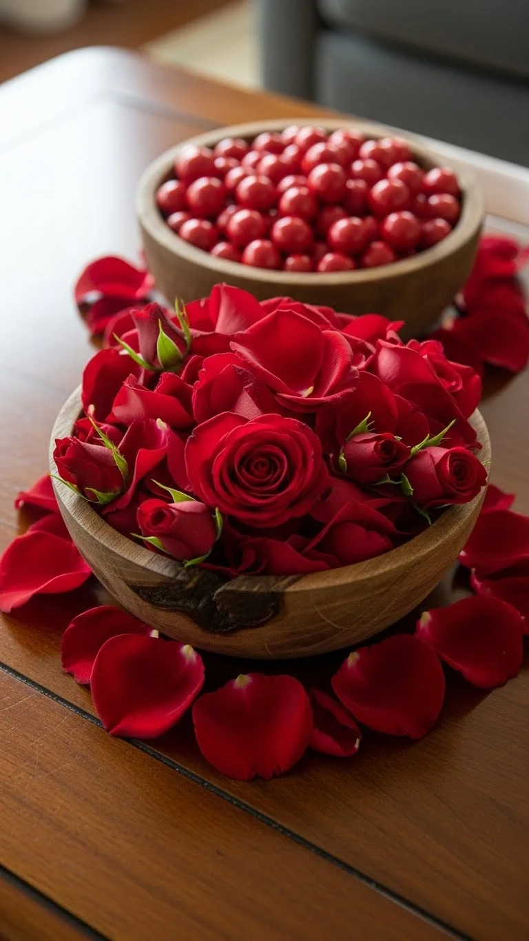 Place red candies or chocolates in small bowls on tables. Sprinkle petals around. This interactive display is playful, festive, and visually striking.