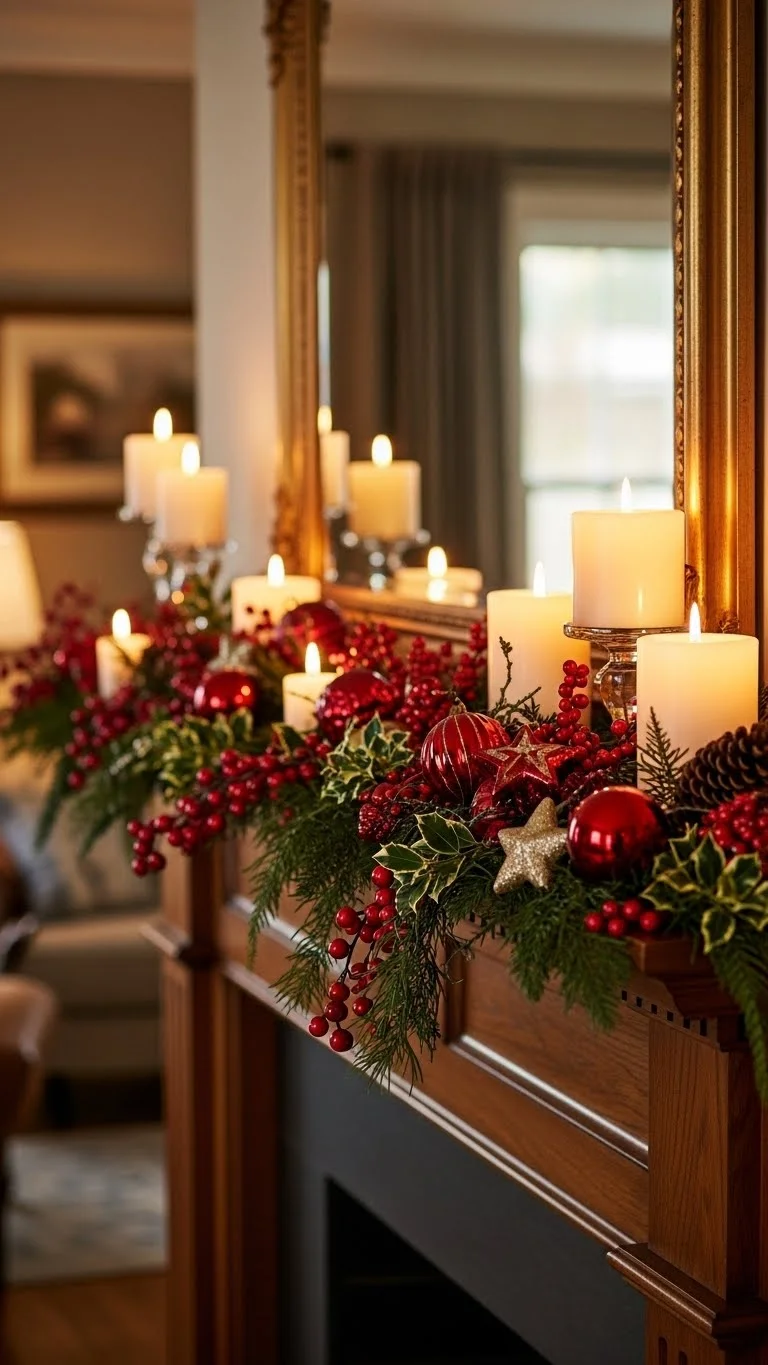 Combine red accents with greenery on mantels. Candles add warmth while color contrast keeps it eye-catching and dramatic.