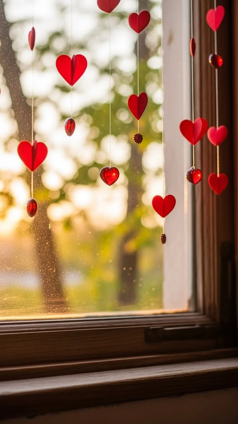 Hang red heart ornaments from windows. Vary lengths and sizes. Paper or felt hearts are inexpensive and DIY-friendly. The result is a playful, bold Valentine display.