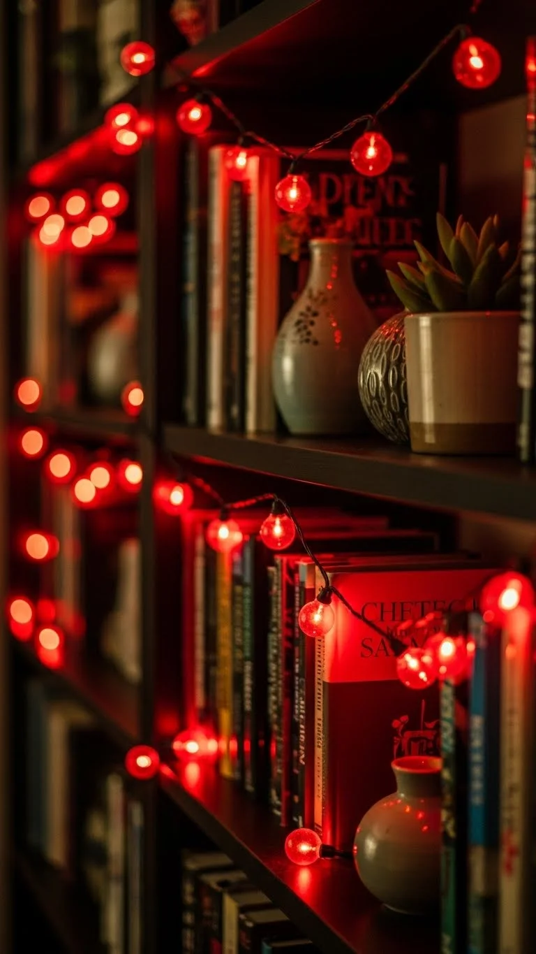 Wrap red-tinted string lights around mantels, shelves, or windows for a dramatic, romantic glow. Loosely draping lights gives a relaxed, whimsical effect. Battery-operated versions are safe and versatile. The red hue instantly adds warmth and sets a festive tone.