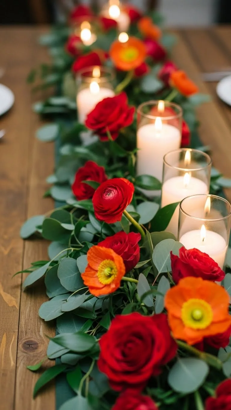 Use a bold red table runner and arrange candles, small bouquets, or votives along it. Pair with subtle cream or gold accents for elegance. This simple change makes a dining table instantly striking while staying budget-friendly and easy to DIY.