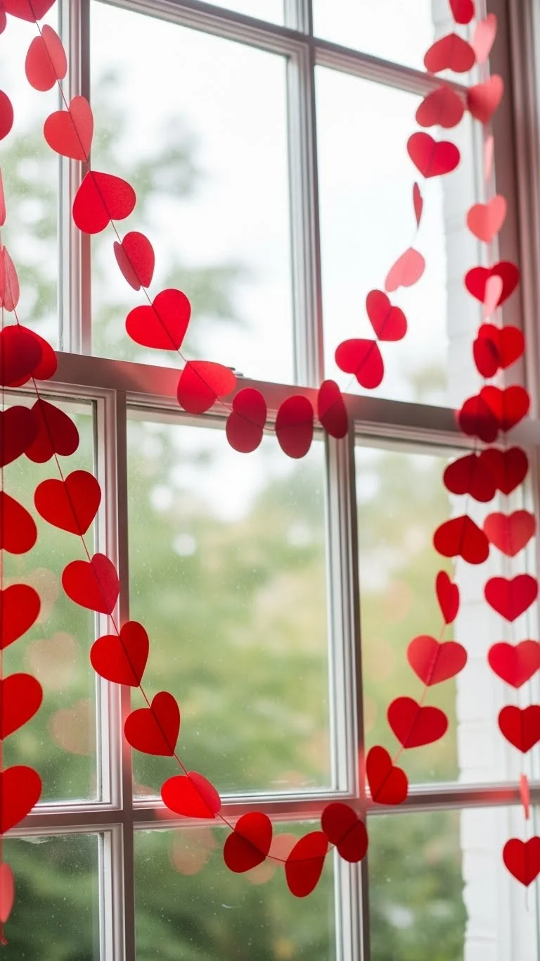 Hang red heart-shaped garlands across windows or walls. Mix sizes for a whimsical look. Paper, felt, or lightweight fabric hearts are inexpensive and easy to DIY. This simple addition packs big visual impact for Valentine’s Day.