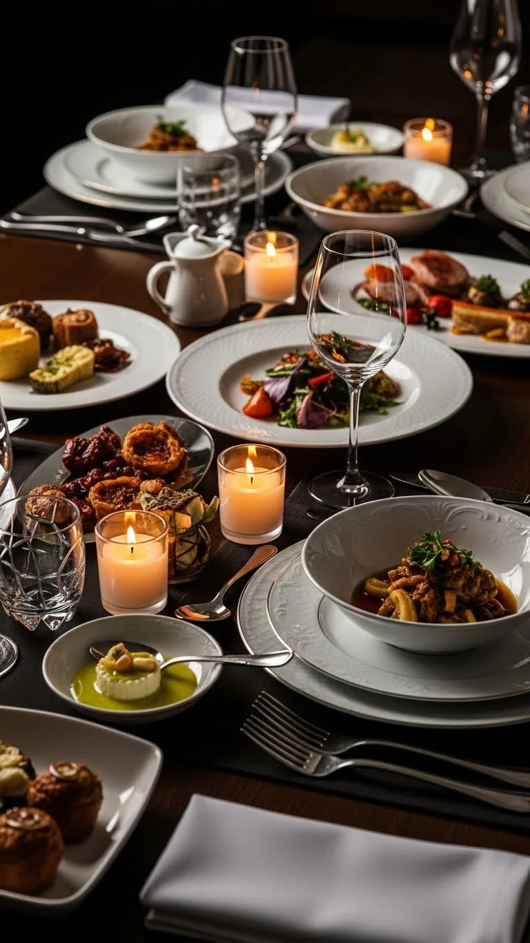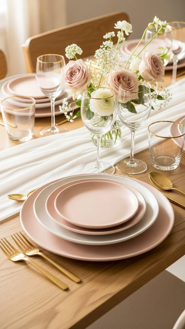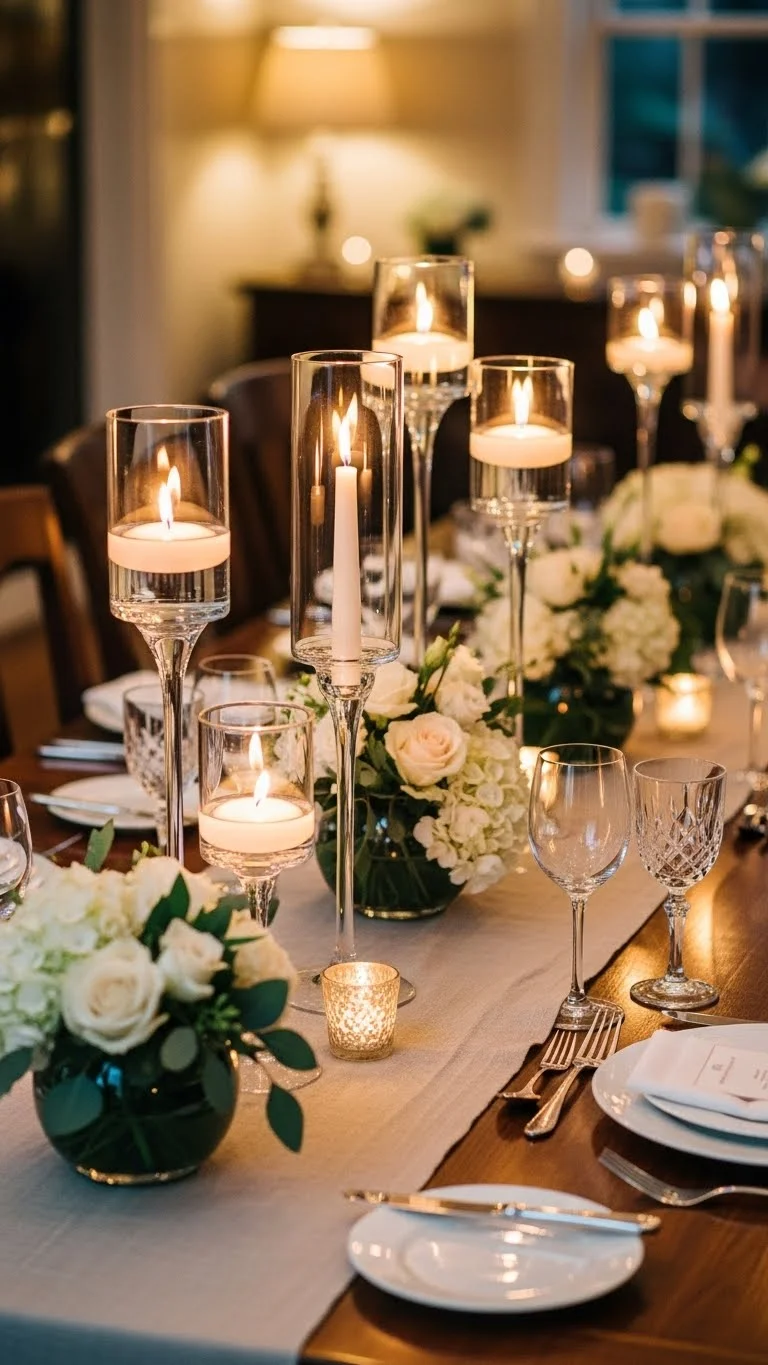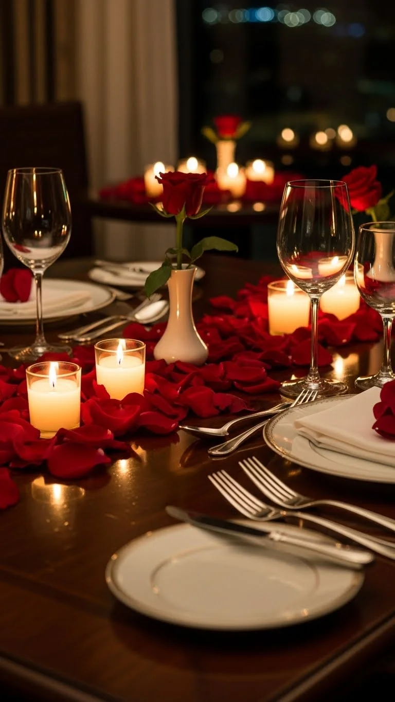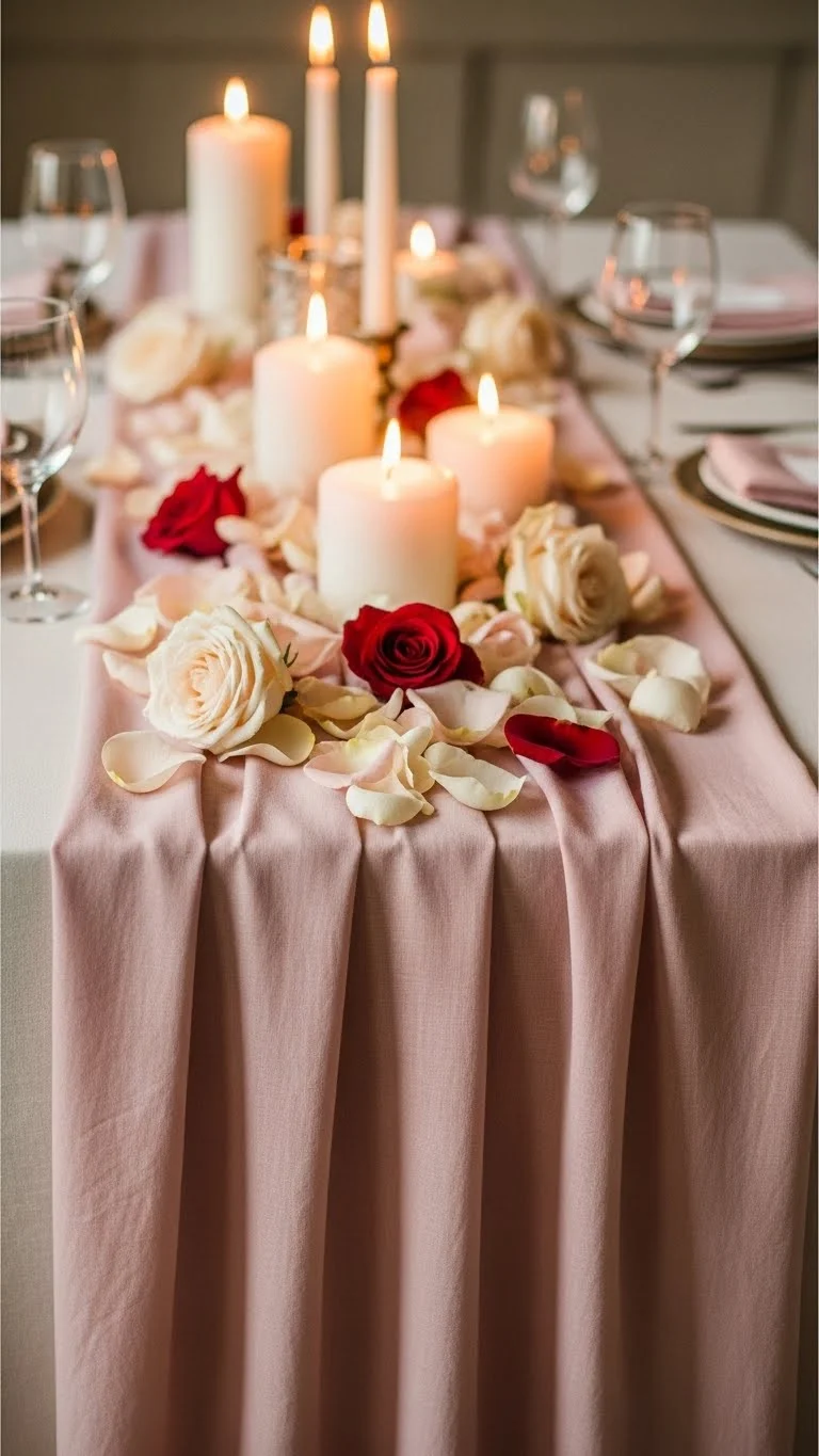 Keep the centerpiece simple: a few candles and petals. Minimalism ensures the table feels elegant without clutter.