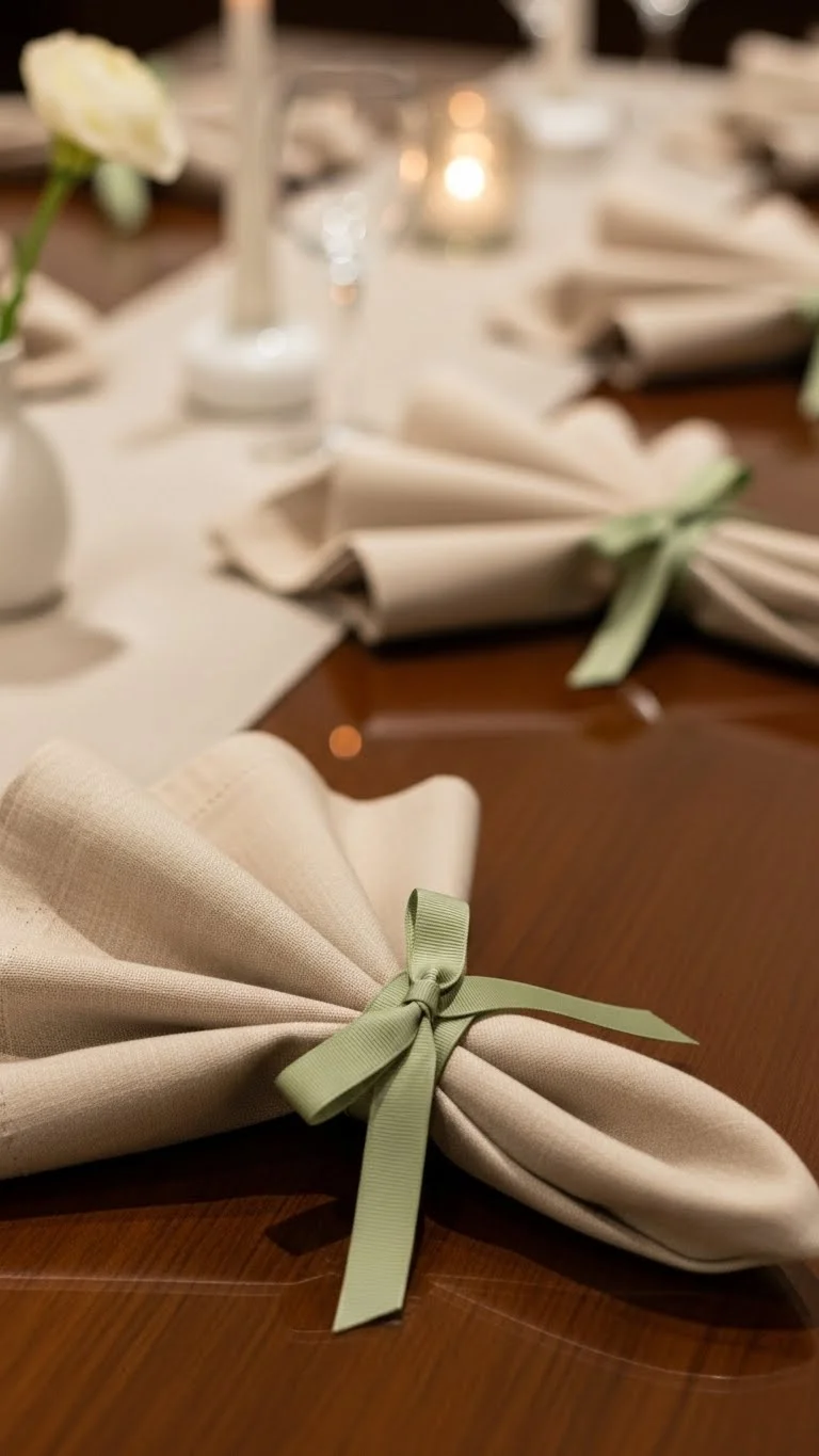 Tie cloth napkins with ribbon in soft tones. Stick with one color to avoid clashing. Ribbon adds elegance and can match other decor elements like flowers or candles.