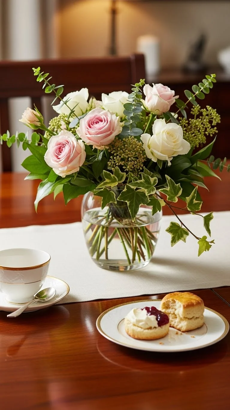 Add soft greenery with roses or other blooms. Eucalyptus or ferns add texture. Keep arrangements low so conversation flows easily across the table.