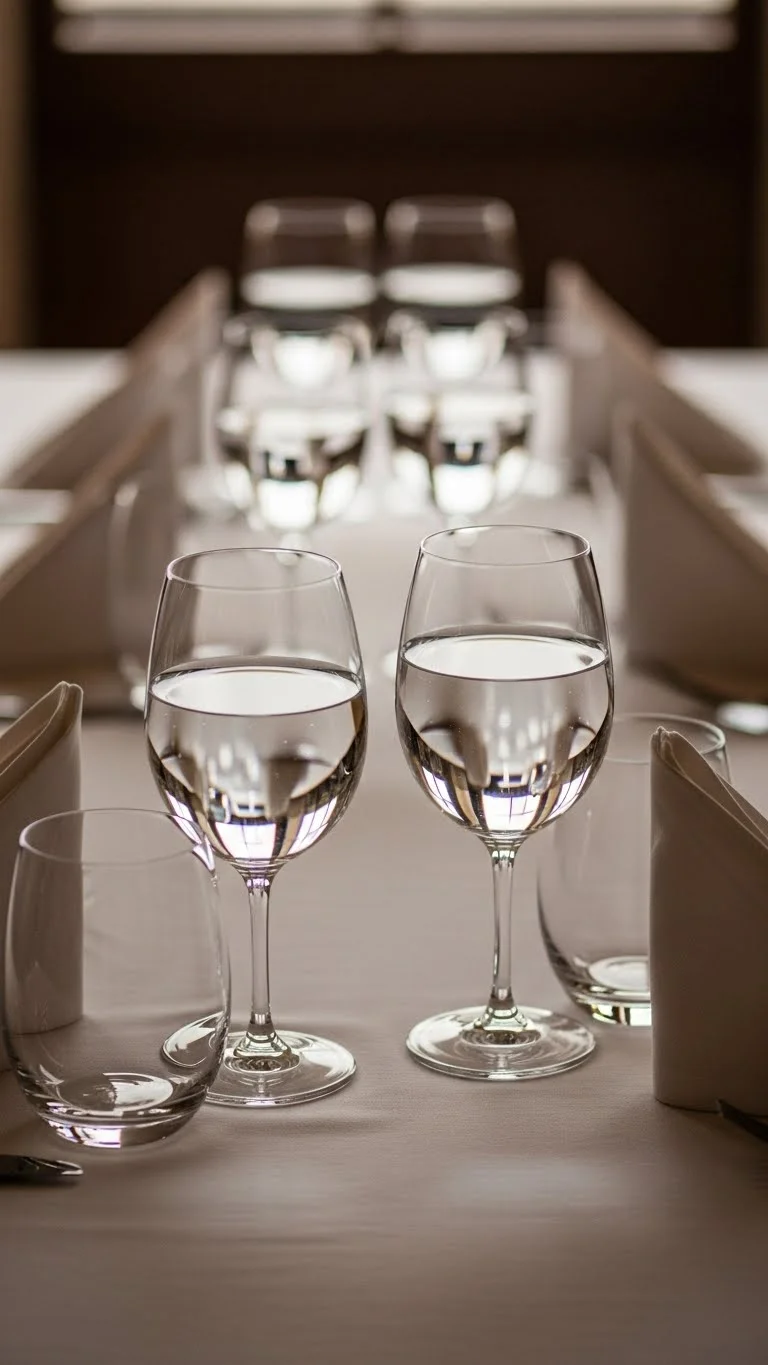 Even plain glasses feel special when polished and aligned. Fold napkins and place beside glasses for a tidy look. Consistency makes a simple table feel refined.