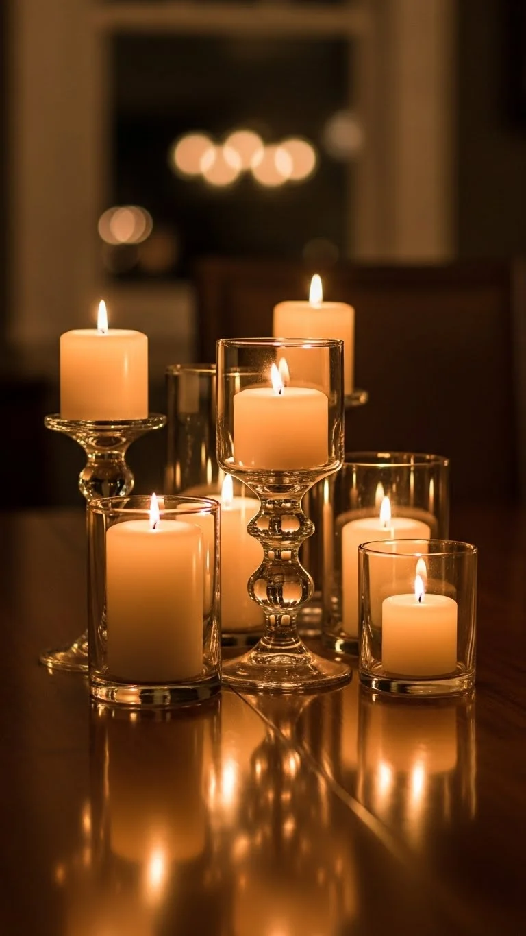 Group candles in odd numbers on the table. Vary heights using tall taper candles and small votives. Place them on a tray or mirrored plate to protect the table. Stick to soft colors like cream or blush. Battery candles work safely around food. Candlelight adds warmth and intimacy, making even a simple table feel elegant.